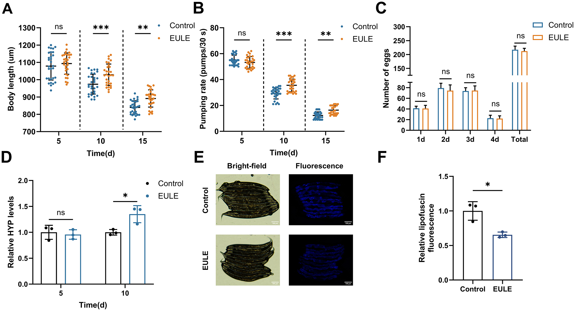 EULE significantly enhances the health status of C. elegans. (A) Changes in body length of wild-type N2 C. elegans after 5, 10, and 15 days of EULE treatment. (B) Pharyngeal pumping frequency within 30 seconds in wild-type N2 C. elegans after 5, 10, and 15 days of EULE treatment. (C) Comparison of egg-laying capacity between the control and EULE-treated C. elegans, including daily egg production during the reproductive period and total egg production. (D) Relative HYP content in wild-type N2 C. elegans after 5 and 10 days of EULE treatment. (E) Representative bright-field and fluorescence images of wild-type N2 C. elegans after 10 days of EULE treatment. Scale bar: 100 μm. (F) Relative intensity of intestinal lipofuscin autofluorescence in wild-type N2 C. elegans following 10 days of EULE treatment. All statistical analyses were performed using unpaired two-tailed Student's t-test. *p < 0.05, **p < 0.01, ***p < 0.001.