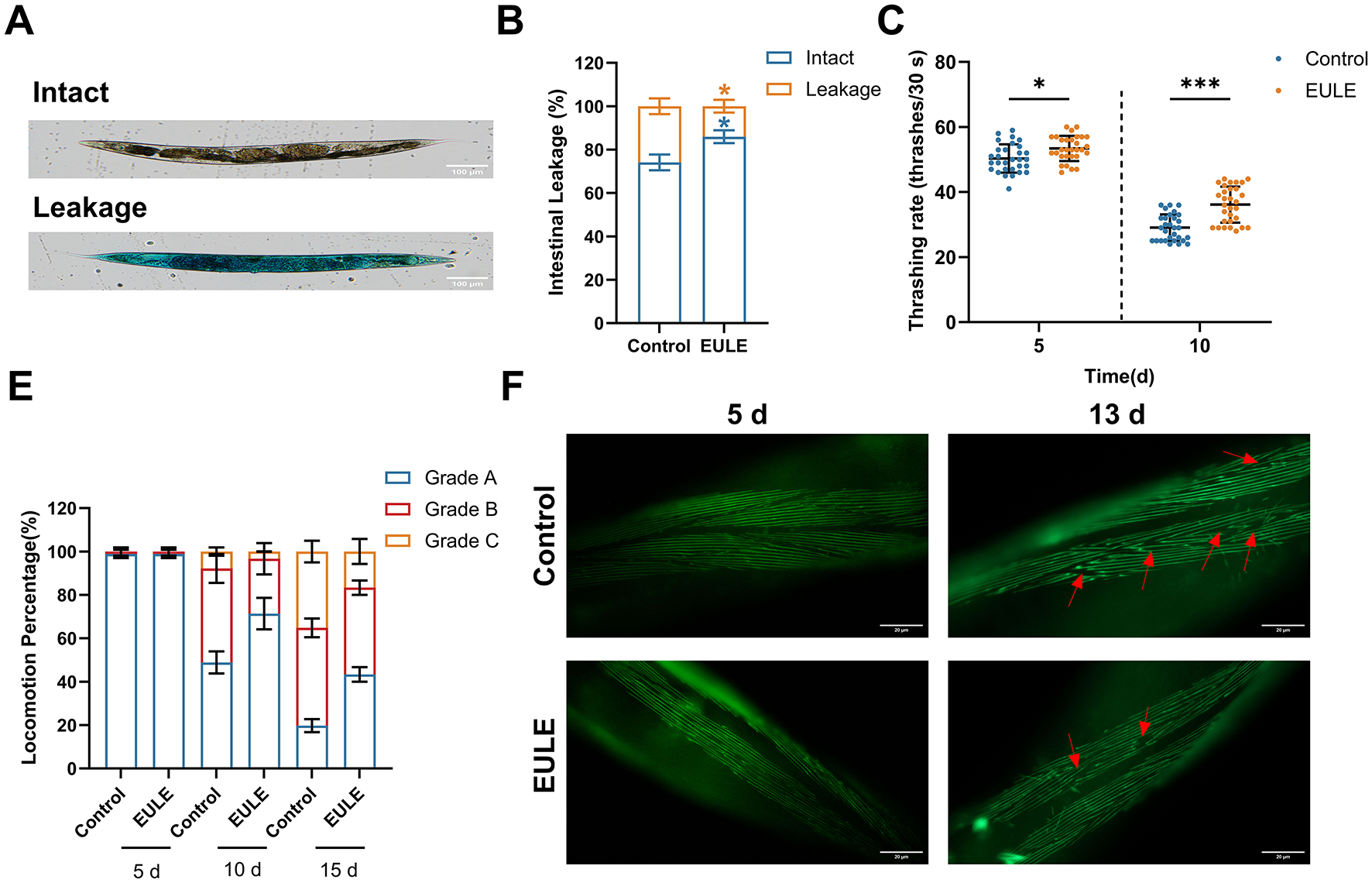 To investigate the impact of EULE on age-associated phenotypes in C. elegans, we quantified pharyngeal pumping rate and body length at days 5, 10, and 15 of cultivation, and body bend frequency was quantified in M9 buffer (33, 34). Furthermore, locomotor function was assessed and classified as Grade A (normal sinusoidal locomotion), Grade B (reduced or irregular movement), or Grade C (movement restricted to head or tail upon tactile stimulation). Intestinal barrier integrity was evaluated in 15-day-old worms following EULE treatment from the L4 larval stage (35). Briefly, worms were collected and washed three times with M9 buffer, then incubated with 5% brilliant blue (w/v in M9 buffer) supplemented with 10 μL E. coli OP50 for 5 h at 20 °C. After washing to remove excess dye, worms were anesthetized with levamisole and mounted on 2% agarose pads for microscopic examination. A compromised intestinal barrier was identified by the leakage of dye from the intestinal lumen into the body cavity. Furthermore, morphological alterations in mid-body muscle fibers were examined in the RW1596 strain at days 5 and 13. Damage to muscle fibers was identified by the presence of obvious fractures, loss, or disordered arrangement of the body wall muscle fibers (36).