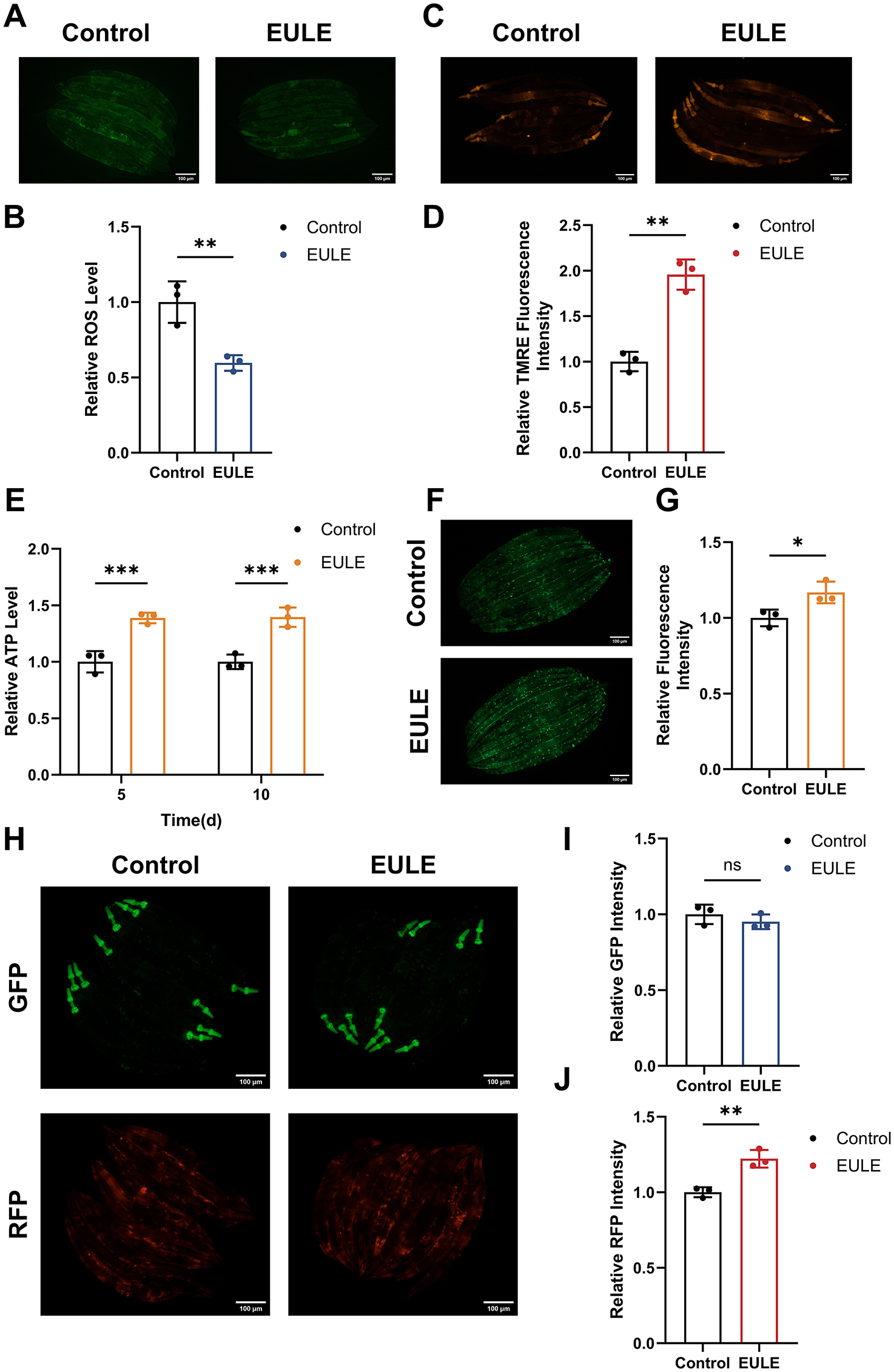 EULE attenuates ROS production, improves MMP, and maintains mitochondrial integrity in C. elegans. (A) Representative fluorescence micrographs depicting ROS levels in wild-type N2 C. elegans following 10 days of EULE administration, visualized with the H2DCF-DA probe. Scale bar: 100 μm. (B) Quantification of ROS-associated fluorescence intensity in wild-type N2 C. elegans after 10 days of EULE exposure, assessed via H2DCF-DA staining. (C) Representative images illustrating MMP in wild-type N2 C. elegans. (D) Quantitative analysis of MMP fluorescence intensity in wild-type N2 C. elegans post 10-day EULE treatment, determined using the TMRE probe. (E) Measurement of relative ATP concentrations in wild-type N2 C. elegans after 5 and 10 days of EULE intervention. (F) Representative fluorescence images of myo-3p::GFP expression in the transgenic PD4251 C. elegans strain following 10 days of EULE treatment. Scale bar: 100 μm. (G) Quantitative assessment of myo-3p::GFP fluorescence intensity in transgenic PD4251 C. elegans after 10 days of EULE exposure. (H) Representative fluorescence images of GFP and RFP in transgenic CB7272 C. elegans after 13 days of EULE treatment. Scale bar: 100 μm. (I) Quantification of GFP fluorescence intensity in transgenic CB7272 C. elegans after 13 days of EULE administration. (J) Quantification of RFP fluorescence intensity in transgenic CB7272 C. elegans after 13 days of EULE administration. All statistical analyses were conducted using unpaired two-tailed Student's t-test. *p < 0.05, **p < 0.01, ***p < 0.001.