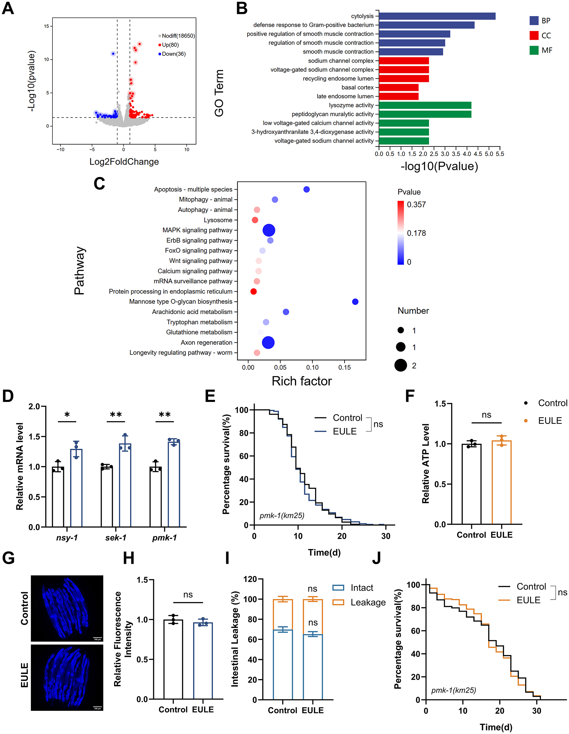 EULE-induced lifespan extension in C. elegans is linked to the MAPK signaling pathway. (A) Volcano plot illustrating differentially expressed genes between control and EULE-treated groups. (B) Top 20 significantly enriched metabolic pathways identified via GO analysis. (C) Top 20 significantly enriched metabolic pathways identified through KEGG pathway analysis. (D) Quantitative expression profiles of nsy-1, sek-1, and pmk-1 following five days of EULE administration. (E) Kaplan-Meier survival analysis of pmk-1 (km25) mutants subjected to EULE treatment. (F) Relative ATP quantification in pmk-1 (km25) mutants post-EULE exposure. (G) Representative micrographs depicting lipofuscin accumulation in pmk-1 (km25) mutants after EULE intervention; scale bar: 100 μm. (H) Quantitative assessment of lipofuscin levels in pmk-1 (km25) mutants following EULE treatment. (I) Statistical evaluation of intestinal barrier integrity (intact vs. compromised) in pmk-1 (km25) mutants after 15 days of EULE exposure, determined by food dye permeability assay. (J) Kaplan-Meier survival curves of pmk-1 (km25) mutants under juglone-induced oxidative stress subsequent to EULE treatment. All statistical analyses were conducted using unpaired two-tailed Student's t-test. *p < 0.05, **p < 0.01.