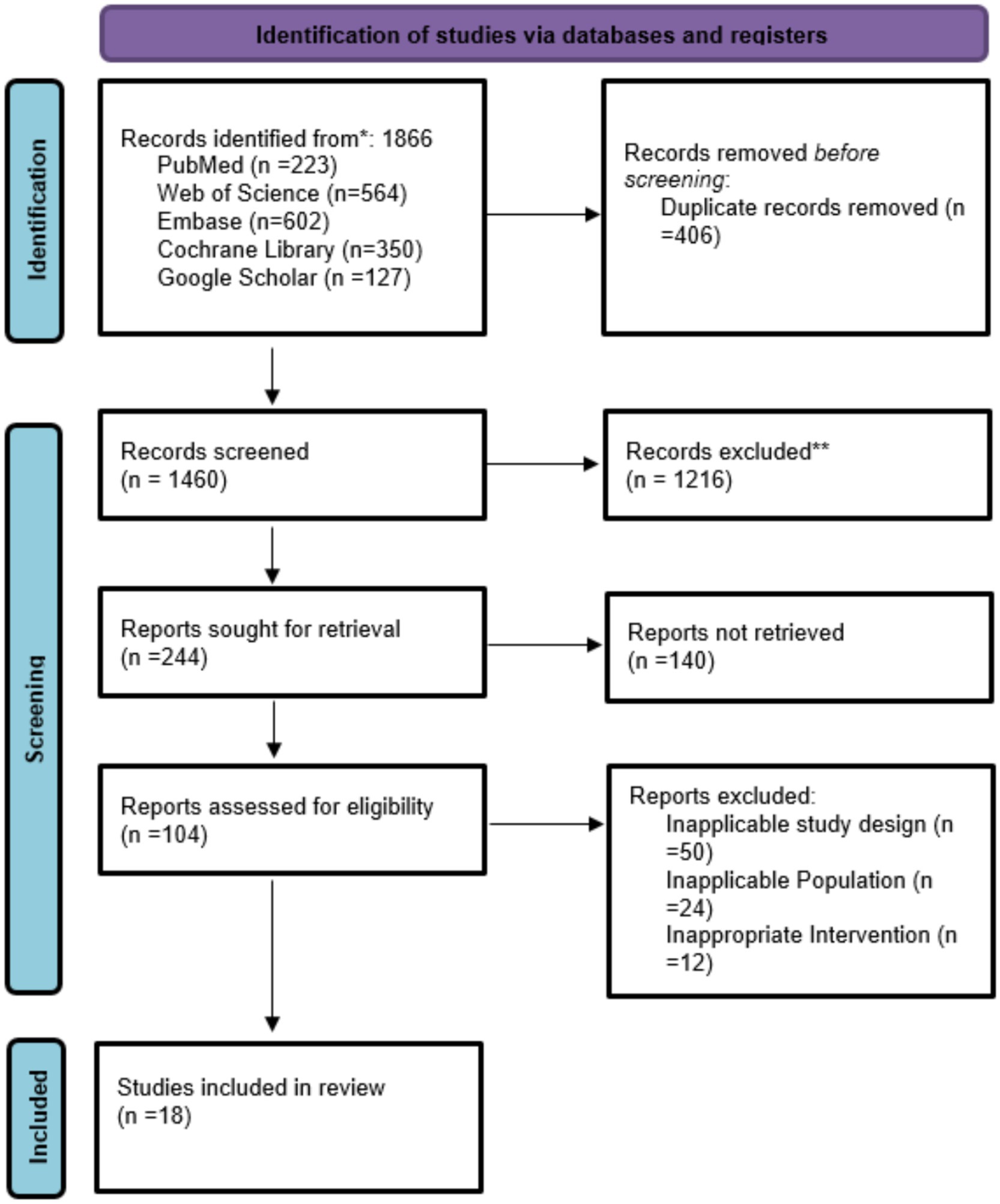 Flowchart detailing study identification and screening through databases for a review. Initially, 1866 records were identified from sources like PubMed, Web of Science, Embase, Cochrane Library, and Google Scholar. After removing 406 duplicates, 1460 records were screened. Of these, 1216 were excluded. 244 reports were sought, with 140 not retrieved. After assessing 104 for eligibility, 86 were excluded for reasons like inapplicable study design, population, or intervention. Finally, 18 studies were included in the review.