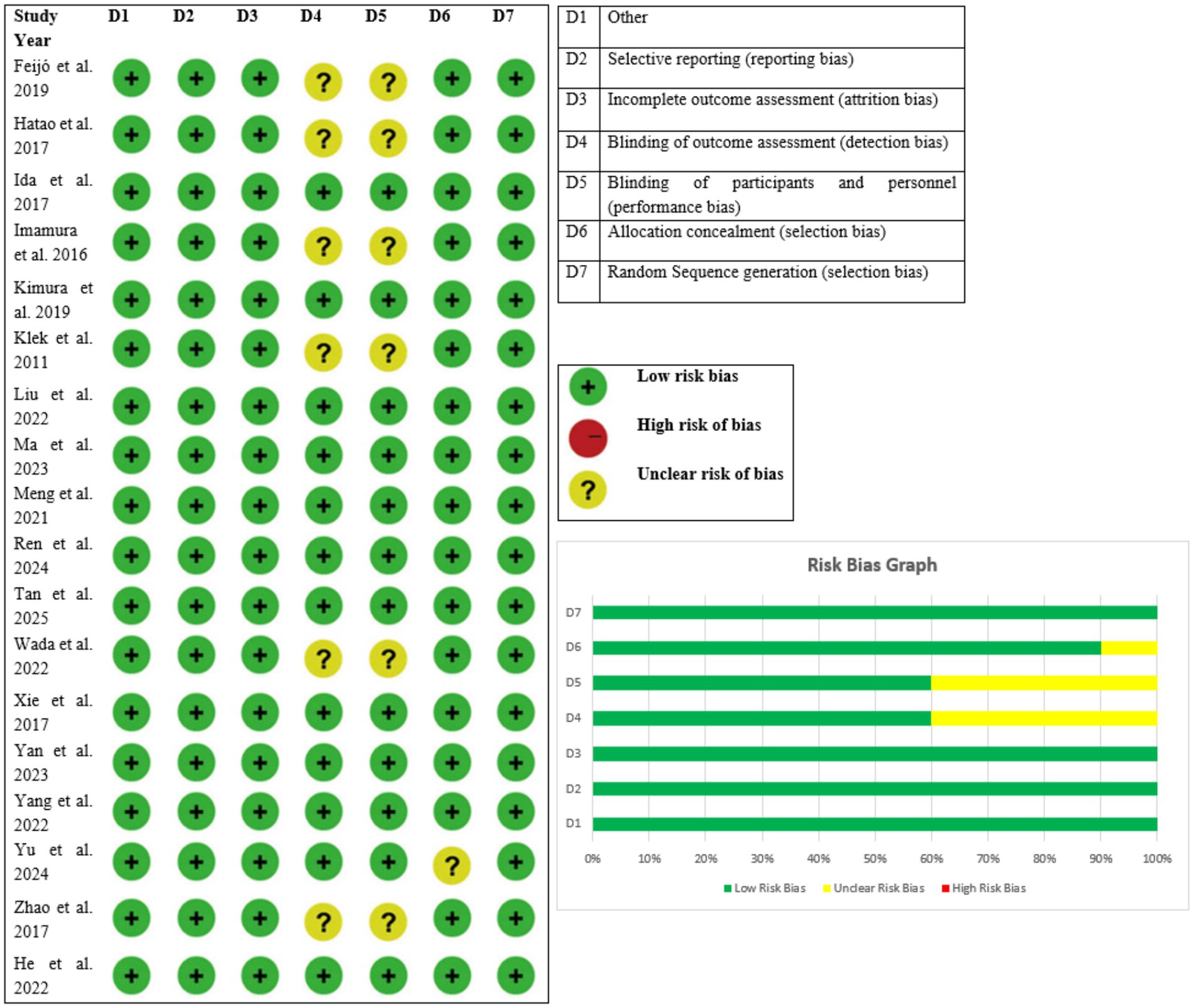 While randomized controlled trials were examined using the Cochrane Collaboration’s risk of bias (RoB) method to determine the risk of bias for individual studies. RoB assesses the risk of bias in an RCT based on seven domains: incomplete outcome data (attrition bias), blinding of personnel and subjects (performance bias), blinding of evaluation of outcomes (detection bias), randomized sequence subsequent generations (selection bias), allocation concealment (selection bias), selective reporting (reporting bias), and other bias. The funnel plot provided an accessible demonstration of publication bias across research.