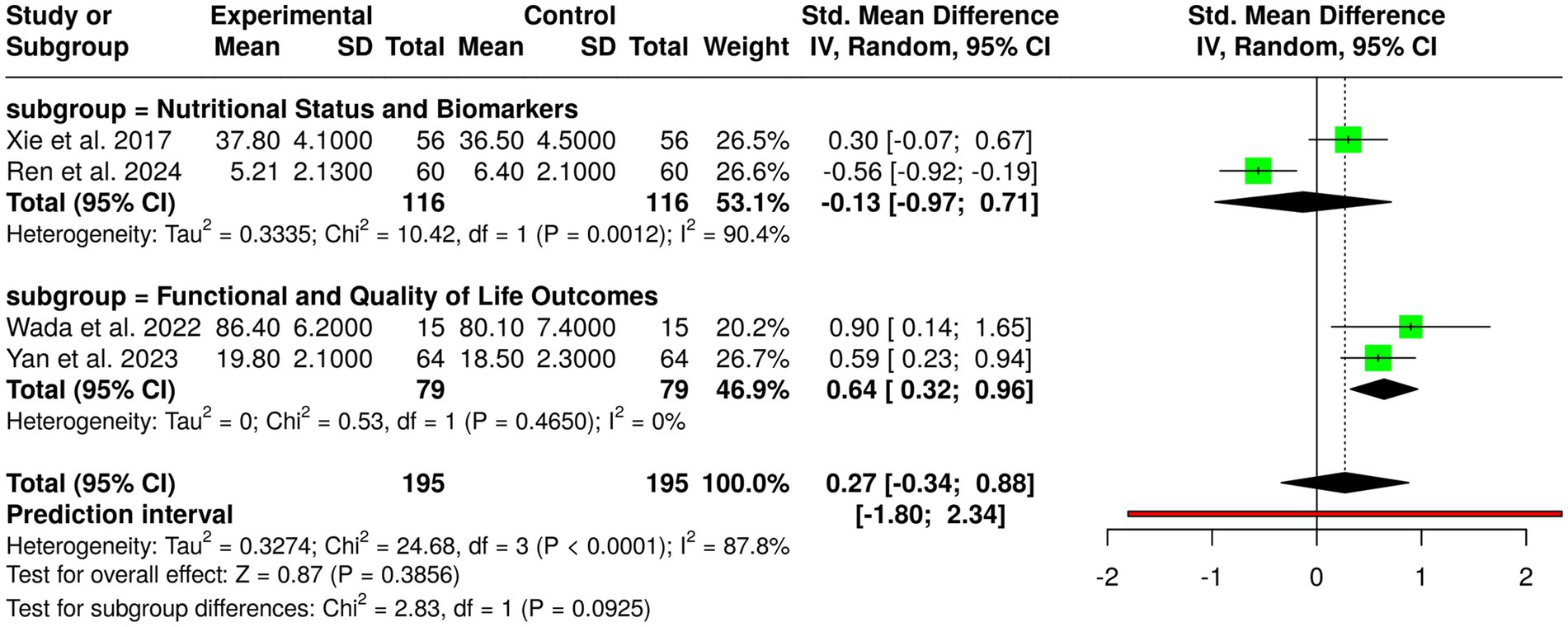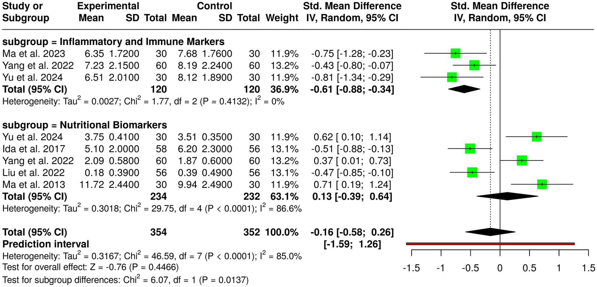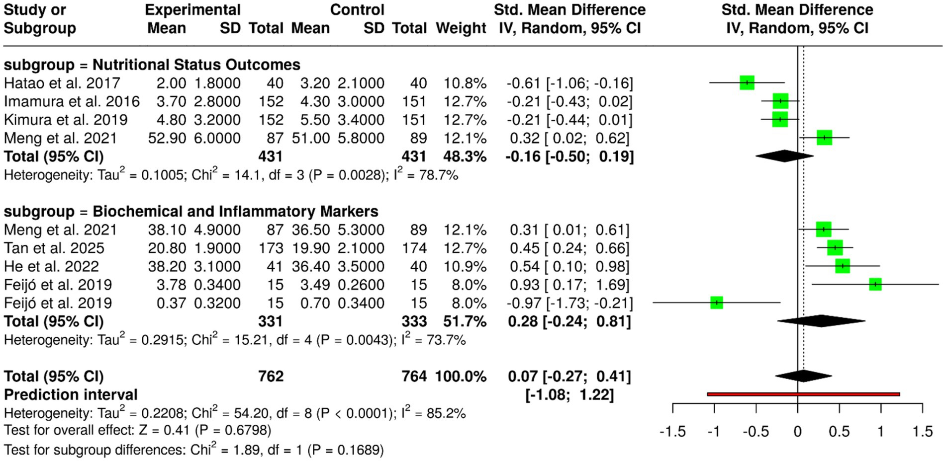 Forest plot displaying standardized mean differences (SMD) with ninety-five percent confidence intervals for two subgroups: Nutritional Status Outcomes and Biochemical and Inflammatory Markers. Each study is represented by a green square, and overall effects are shown as black diamonds. Heterogeneity statistics are provided, with subgroup totals and overall results summarized at the bottom. The plot includes a prediction interval ranging from -1.08 to 1.22.