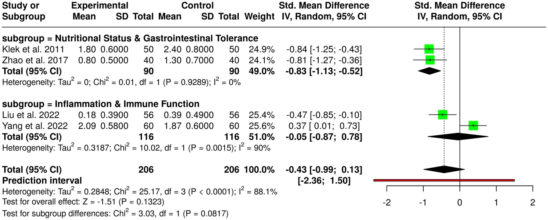 Immunonutrition treatments involving ω-3 fatty acids, arginine, and RNA-supplemented formulas have been studied in randomized controlled trials of a total of 354 patients in the experimental group and 352 patients in the control group with gastric cancer. Individual trials showed positive impacts: Ida et al. (17) had fewer infections postoperatively and lower IL-6 and CRP with perioperative immunonutrition; Liu et al. (7) had fewer infections on the application of probiotics during neoadjuvant chemotherapy; Ma et al. (8) had higher CD4/CD8 ratio and lower CRP after gastrectomy with immunonutrition; Yang et al. (13) with EN, PN, and ω-3 combined post-gastrectomy increased IgA and decreased IL-6; and Yu et al. (14) with perioperative immunonutrition in cachectic patients had better albumin levels and decreased CRP. Despite such promising findings within individual trials, no significant overall effect was identified by pooled analysis with inverse variance method of a random-effects model, on a combined standardized mean difference of −0.16 (95% CI, −0.58 to 0.26). There was considerable heterogeneity observed (p < 0.01; I2 = 85%), indicating substantial variation among interventions, patient groups, study duration, and outcomes. Overall, while immunonutrition has beneficial effects on immunological factors, inflammatory responses, and infection in gastric cancer patients, the overall evidence remains uncertain and needs additional larger, homogeneous trials to determine the best formulae and timing of immunonutritional therapy administration (Figure 4).