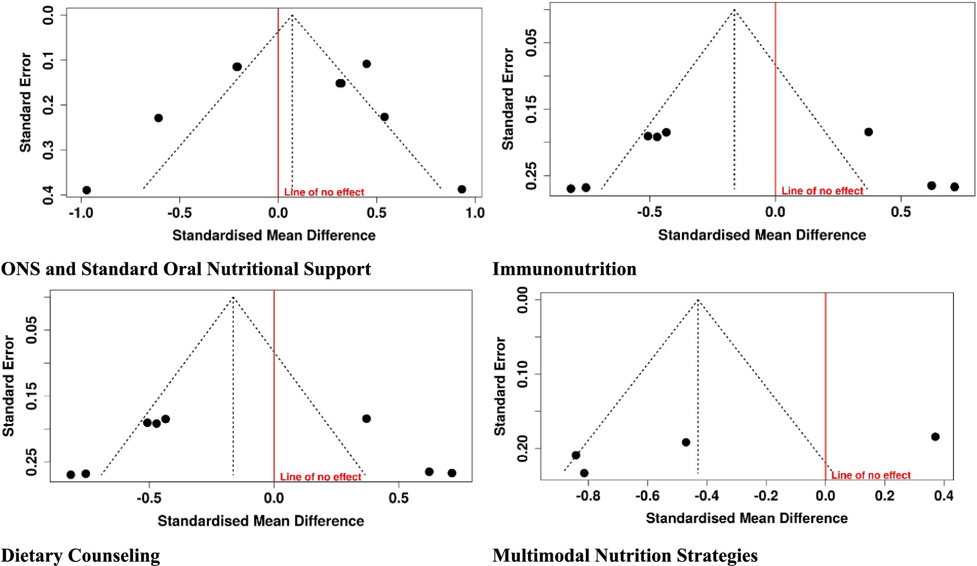 Four funnel plots analyze publication bias in nutrition strategies. Each plot displays standardized mean difference against standard error, with a vertical