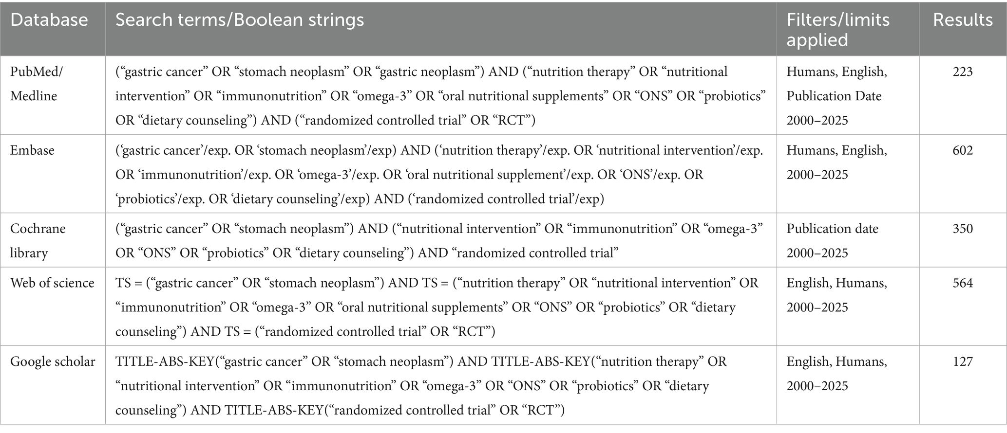 Notwithstanding the accumulation of evidence to support perioperative nutritional therapy, some lacunae are still in the literature. Optimal composition, timing, and duration of nutrition support strategies continue to be controversial, with no consensus on putting standardized protocols into practice. Also, heterogeneity among individuals for nutritional status, tumor burden, and metabolic response complicates creating a one-size-fits-all solution. All the prior studies have limited sample sizes, patient selection bias, and methodological flaws that preclude generalizability of findings. Systematic review and meta-analysis are hence necessary to synthesize existing evidence, determine the most effective nutritional interventions, and make clear clinical recommendations for optimal perioperative nutrition in gastric cancer patients (3). A number of randomized controlled trials (RCTs) have compared the effectiveness of such nutritional interventions among gastric cancer patients about to undergo surgery, but results are still inconsistent within individual trials, with differences in intervention types, dose, timing, and outcomes measured (5). Although previous systematic reviews have investigated nutritional interventions among more general gastrointestinal or oncologic patient groups, a dedicated meta-analysis combining solely RCT evidence among gastric cancer patients in the perioperative setting is rare (6). In order to fill this gap, the current study systematically searches and quantitatively analyses RCTs assessing the efficacy of perioperative nutrition treatment on surgical outcomes in gastric cancer patients. Outcomes of interest include postoperative nutritional status, inflammatory markers, immune function, complications, and short-term recovery indicators. Through stratification by intervention type, this review aims to provide more precise and clinically relevant guidance regarding nutritional management for this at-risk patient group. This meta-analysis was aimed at establishing the efficacy of several perioperative nutritional therapy regimens on patients with gastric cancer undergoing surgery. The primary objectives include ascertaining the impact of treatment on post-operative complications, in-patient hospital stay, tolerability of therapy, immune function, and mortality. By synthesizing evidence from randomized controlled trials (RCTs), the present review aims to provide evidence-based recommendations that can be practical in clinical practice and help enhance patient outcomes. The present study will also examine subgroup differences according to patient characteristics, and modalities of nutritional intervention to enhance personalized nutritional regimens for gastric cancer treatment.