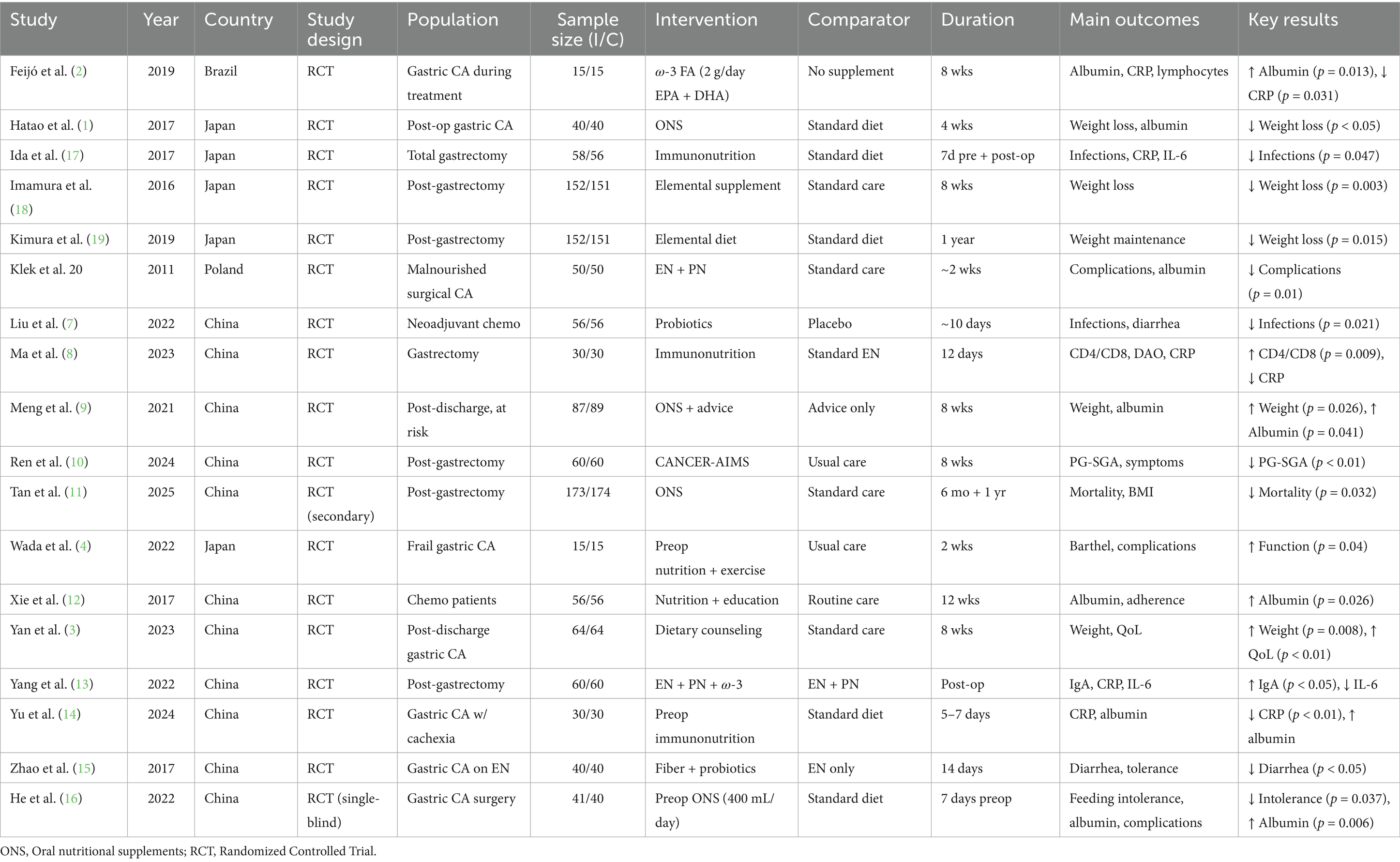 The features of the included randomized controlled trials are outlined in Tables 1 and 2. There were 18 studies included, performed in various countries which include China (3, 716), Japan (1, 4, 1719), Brazil (2), and Poland (20). The majority of studies were based on surgical patients with gastric cancer. Interventions tested were heterogeneous and ranged from oral nutritional supplements (ONS) to elemental diets, immunonutrition, probiotics, fiber-enriched enteral formulas, perioperative enteral or parenteral nutrition, and individualized dietary advice or multimodal rehabilitation programs. The trials were parallel-group RCTs. Intervention duration varied from short-term perioperative treatment (5–14 days) to extended post-discharge nutritional therapy lasting up to 1 year (Table 2).