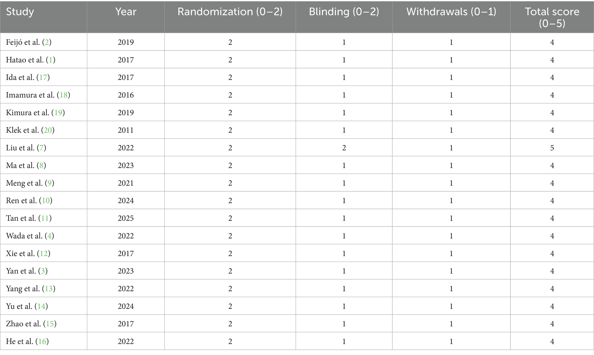 The methodological quality of the 18 randomized controlled trials included in the review was determined using the Jadad scale, which scores randomization (0–2), blinding (0–2), and withdrawals/dropouts (0–1), for a maximum score of 0–5 (Figure 2). All the studies had high methodological quality, with a score of 4–5. In particular, 17 studies scored a total of 4, indicating sufficient randomization, single or partial blinding, and proper treatment of withdrawals or dropouts. Liu et al. (7) was the sole study to score a perfect 5, reflecting ideal randomization, double blinding, and reporting of attrition. The high scores in all studies consistently indicate that the trials included in the review were mostly of good quality and that risk of bias was minimal. These results give assurance that the outcome of the meta-analysis is grounded on sound and well-performed trials, and this ensures the validity of the general conclusions drawn on the impact of nutritional interventions among gastric cancer patients (Table 4).