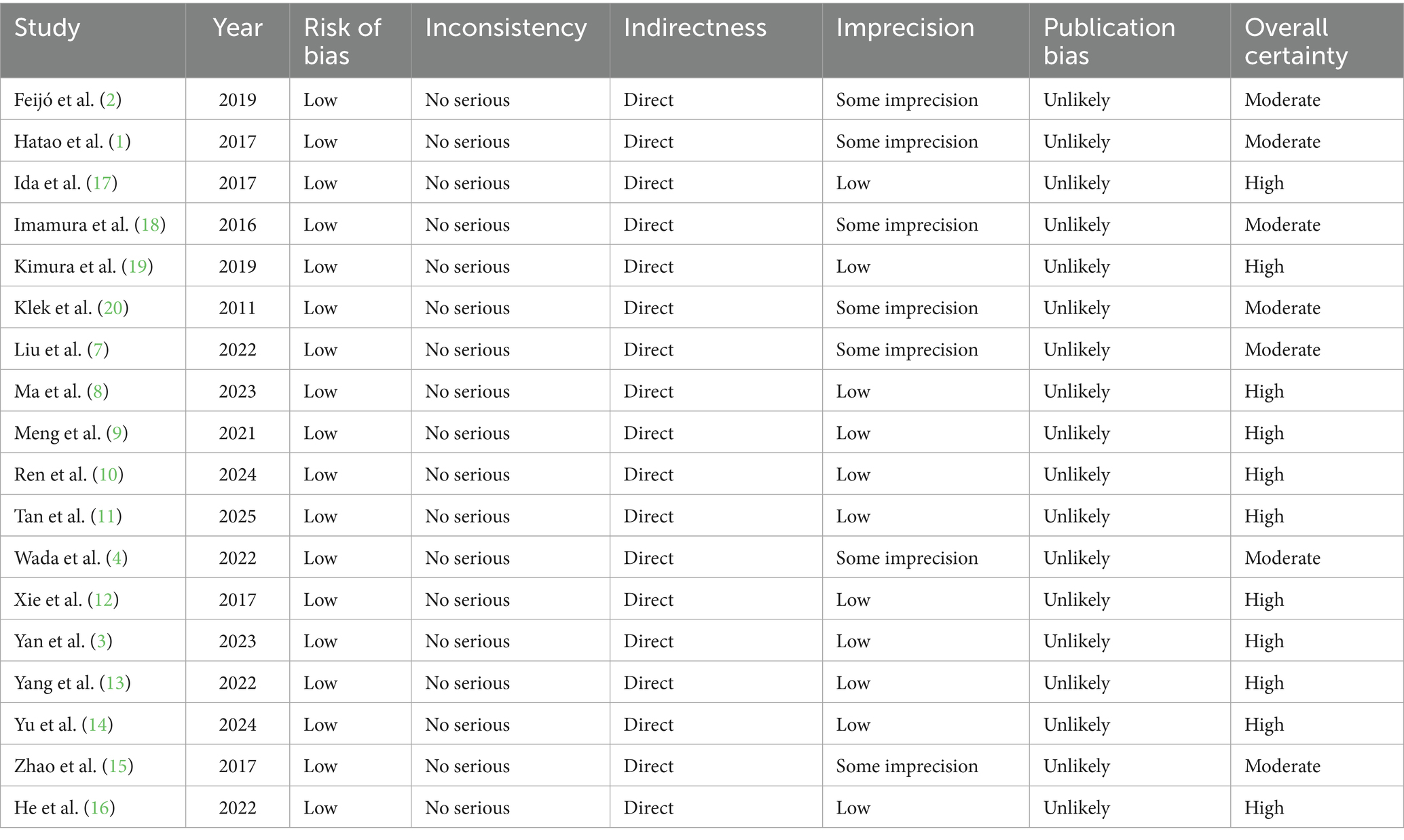 All the studies were considered to have low risk of bias and directness of evidence with no important inconsistency found across outcomes. Imprecision was slightly varied with some studies having slight uncertainty in effect estimates while others had low imprecision. For all trials, publication bias was considered to be unlikely (Figure 1). According to these criteria, the overall confidence of evidence was assessed as high in 11 studies (3, 8–14, 16, 17, 19) and moderate in 7 studies (1, 2, 4, 7, 15, 18, 20). These results show that the trials included offer strong and credible evidence to confirm the outcomes of nutritional interventions on biochemical, immunological, and clinical outcomes among patients with gastric cancer, which further increases the trust in the meta-analysis outcome (Table 3).