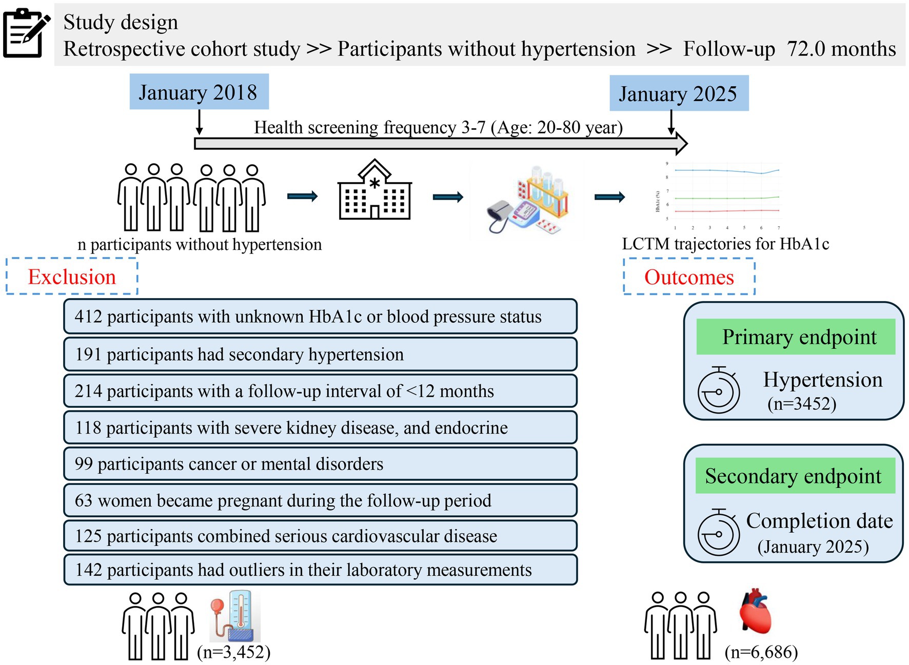 To address this research gap, our team utilized a 7-year longitudinal dataset from the Health Screening Center of Henan Provincial People’s Hospital. Using advanced latent class trajectory modeling (LCTM), we systematically assessed the association between baseline HbA1c levels, their dynamic trajectories, and the risk of developing hypertension. This study aims not only to clarify the potential value of HbA1c as a biomarker for predicting hypertension risk but also to explore its practical implications for clinical risk stratification and early preventive interventions. Ultimately, the results could provide theoretical and empirical foundations for developing innovative cardiovascular prevention strategies based on dynamic monitoring of metabolic indicators.