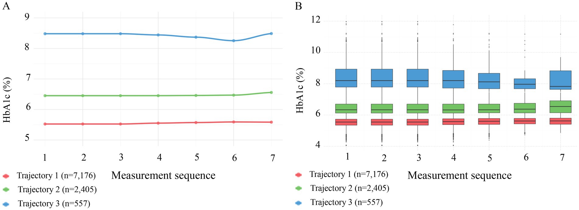 Figure 2. Patterns of HbA1c across three trajectory groups during follow-up. (A) Line graphs showing mean HbA1c levels across 7 sequential measurements. Trajectory 1 (red, n = 7,176) maintained a low level of ~5.5%; Trajectory 2 (green, n = 2,405) maintained a medium level of ~6.5%; and Trajectory 3 (blue, n = 557) maintained a high level of ~8.3%. (B) Box plots illustrating the distribution of HbA1c across the three trajectory groups, confirming that the groups maintained stable and distinct HbA1c distributions throughout the follow-up period.