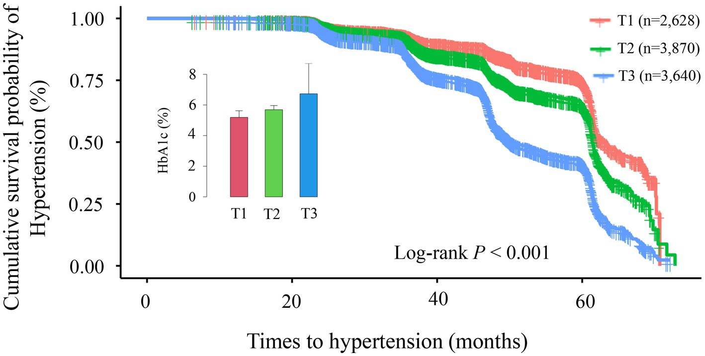 Figure 3. Kaplan–Meier survival curve analysis for hypertension incidence across different tertile groups (T1–T3). The Kaplan–Meier curves demonstrate significant differences in cumulative hypertension incidence among the three groups (log-rank p < 0.001). Cumulative incidence rates were: T1 group (red line, n = 2,628): 21.84%; T2 group (green line, n = 3,870): 28.42%; T3 group (blue line, n = 3,640): 48.85%. Over the follow-up period (0–70 months), the survival curves progressively diverged, indicating persistent differences between groups over time. The inset displays a comparison of glycated hemoglobin (HbA1c) levels across groups.