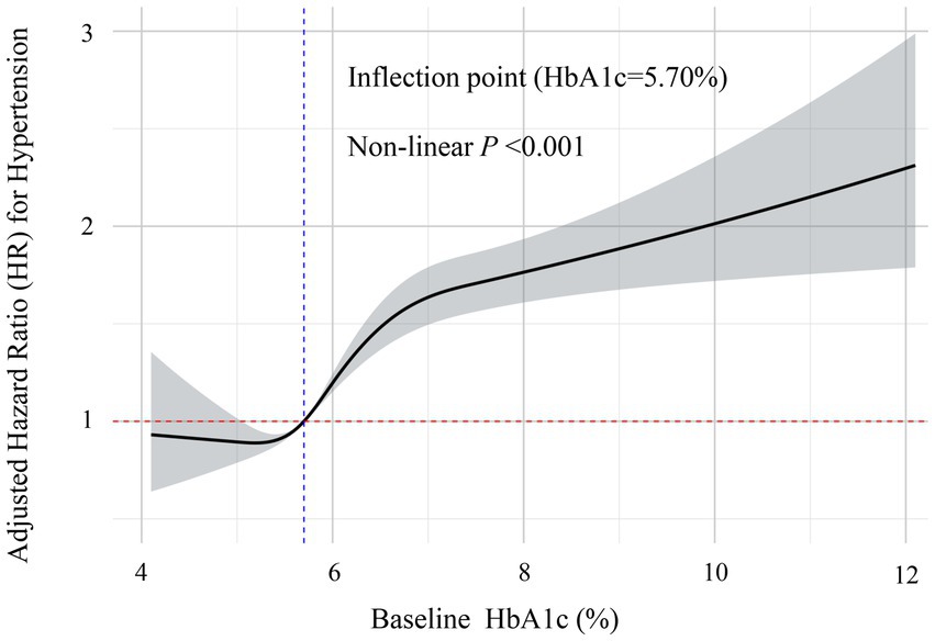 Figure 5. Restricted cubic spline analysis of the non-linear dose–response relationship between baseline HbA1c levels and risk of hypertension. This figure demonstrates the non-linear association between HbA1c levels and the risk of incident hypertension after full adjustment for confounders. The solid line represents the adjusted hazard ratio (HR) estimates, with the gray-shaded area indicating the 95% confidence interval. The analysis identified a significant non-linear inflection point at HbA1c = 5.70% (marked by the blue vertical dashed line). Below this threshold, the relationship with hypertension risk remained relatively stable, while above 5.70%, the risk of hypertension increased significantly with rising HbA1c levels (non-linear p < 0.001). The red horizontal dashed line represents the reference risk level (HR = 1.0).
