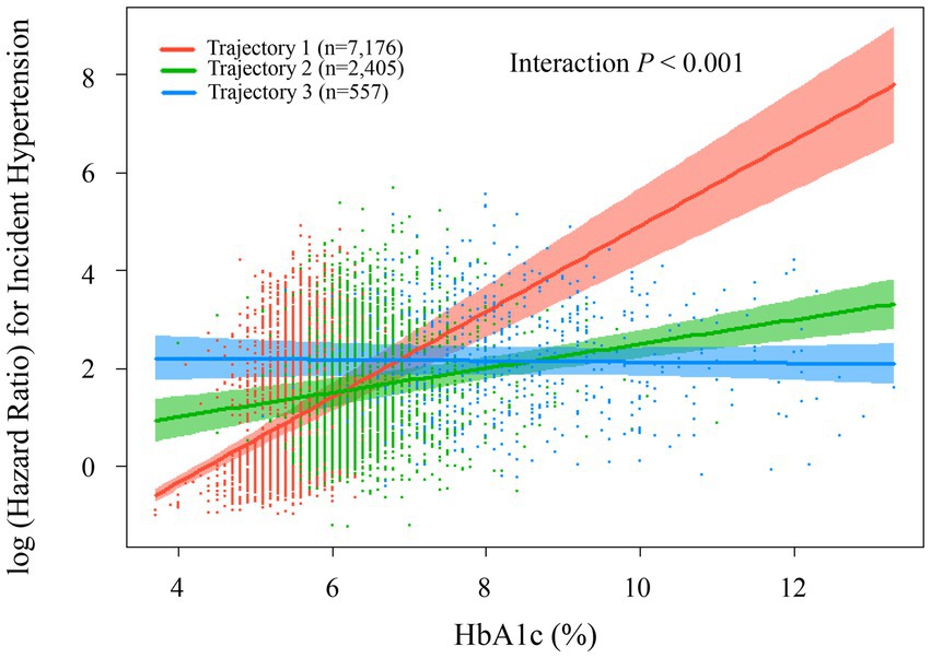 Subsequently, we utilized a Cox regression model with restricted cubic splines to further examine the relationship between HbA1c trajectories and hypertension risk. The analysis identified a significant interaction among the three distinct trajectory groups (p < 0.001). Trajectory 1 (red line, n = 7,176) demonstrated a marked increase in hypertension risk with rising HbA1c levels, particularly accelerating after HbA1c surpassed 6%. When HbA1c reached approximately 12–13%, the logarithmic hazard ratio approached 8, indicating a substantial escalation in hypertension risk. Participants within this trajectory may represent individuals highly sensitive to elevated blood glucose levels. Trajectory 2 (green line, n = 2,405) displayed a moderate positive relationship between HbA1c and hypertension risk. The association was relatively gradual; as HbA1c levels increased from 4 to 12%, the logarithmic hazard ratio rose moderately from approximately 1 to around 3.5. Trajectory 3 (blue line, n = 557) showed a relatively stable pattern, maintaining consistently high hypertension risk (log hazard ratio around 2.0) across various HbA1c levels. This indicates that hypertension risk in this group was minimally influenced by fluctuations in HbA1c levels. These findings suggest that the three trajectory groups represent distinct patterns of association between blood glucose and blood pressure within the study population. Particularly for individuals in trajectory 1, there was a pronounced link between HbA1c and hypertension risk, indicating this subgroup could derive substantial benefits from improved glucose management for hypertension prevention. These relationships are clearly illustrated in Figure 6.