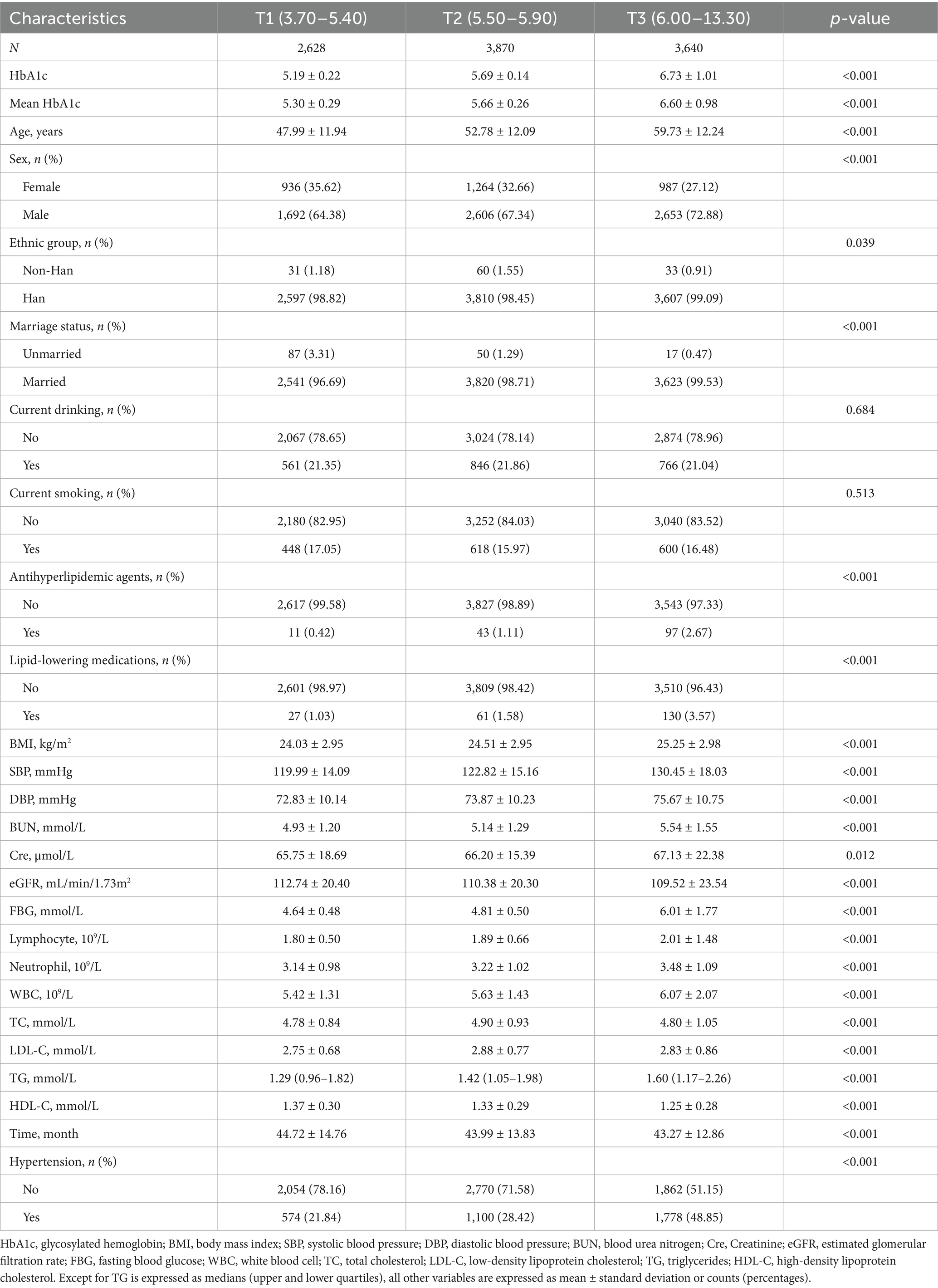 To comprehensively evaluate the relationship between HbA1c and hypertension risk, we first examined the association between baseline HbA1c levels and hypertension incidence. The study included 10,138 adults who underwent routine health screenings, with an average age of 54.03 ± 12.97 years; among them, 3,187 (31.44%) were women. The overall mean baseline HbA1c level for the cohort was 5.91 ± 0.83%. Detailed baseline characteristics of all participants are summarized in Supplementary Table S1. Participants were categorized into tertiles (T1, T2, and T3) based on baseline HbA1c levels. The T1 and T2 groups consisted predominantly of individuals with normal to mildly elevated glucose levels, with 31.8% of T2 participants approaching prediabetic status (HbA1c ≥ 5.70%), and both groups having blood pressure levels ranging from optimal to prehypertensive. Compared to the T1 and T2 groups, participants in the highest HbA1c tertile (T3) were significantly older, predominantly male, had higher BMI, were more frequently married, and reported greater use of antihyperlipidemic and lipid-lowering medications (all p < 0.001). Furthermore, the T3 group exhibited significantly higher levels of BUN, Cre, FBG, lymphocytes, neutrophils, WBC, TC, LDL-C, and TG, alongside lower eGFR and HDL-C, compared to the other groups (all p < 0.001). Additionally, the incidence of hypertension in the T3 group (48.85%) was significantly higher than that observed in the T2 (28.42%) and T1 (21.84%) groups. These findings are comprehensively summarized in Table 1.