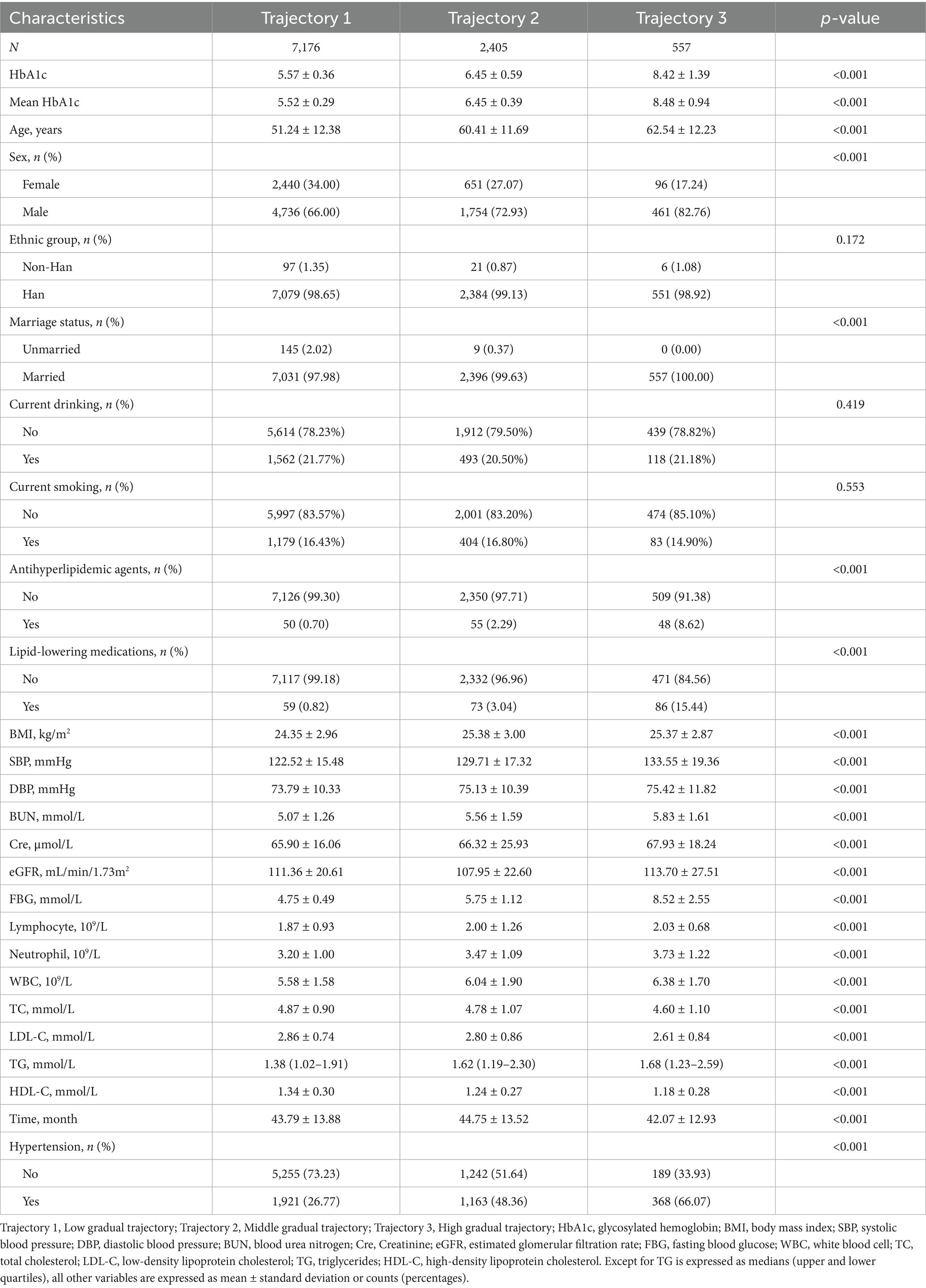 Glycated hemoglobin (HbA1c), one of the most important types of hemoglobin, reliably reflects average blood glucose levels over the previous 8–12 weeks (8). Compared with fasting blood glucose (FBG), HbA1c provides a more comprehensive picture of long-term glucose control, is less affected by temporary fluctuations, and is thus considered stable and reliable (9). It serves as a primary indicator for assessing the quality of diabetes management in healthcare settings (10). Diabetes commonly coexists with hypertension, and previous studies have established a strong relationship between elevated HbA1c levels and increased risks of both diabetes and hypertension (11, 12). A cross-sectional study involving 1,462 non-diabetic Chinese individuals found that higher HbA1c levels significantly increased the risk of hypertension and isolated systolic hypertension (13). Prospective studies have also confirmed this strong relationship. For instance, a longitudinal study using data from the China Health and Nutrition Survey (n = 4,074) identified a significant association between HbA1c and hypertension risk (14). Similarly, recent data from the U. S. National Health and Nutrition Examination Survey (NHANES, 2011–2018; n = 10,503) demonstrated an independent association between HbA1c and adult hypertension risk (15). Nevertheless, most studies have only measured HbA1c at a single time point, ignoring the potential significance of changes in HbA1c over time (16). Additionally, previous research typically examined baseline HbA1c or trajectories separately, limiting a comprehensive understanding of how HbA1c influences hypertension risk. An integrated approach—combining immediate risk assessment based on baseline HbA1c and long-term evaluation through trajectory patterns—can offer deeper insights into the role of HbA1c in the development and progression of hypertension.