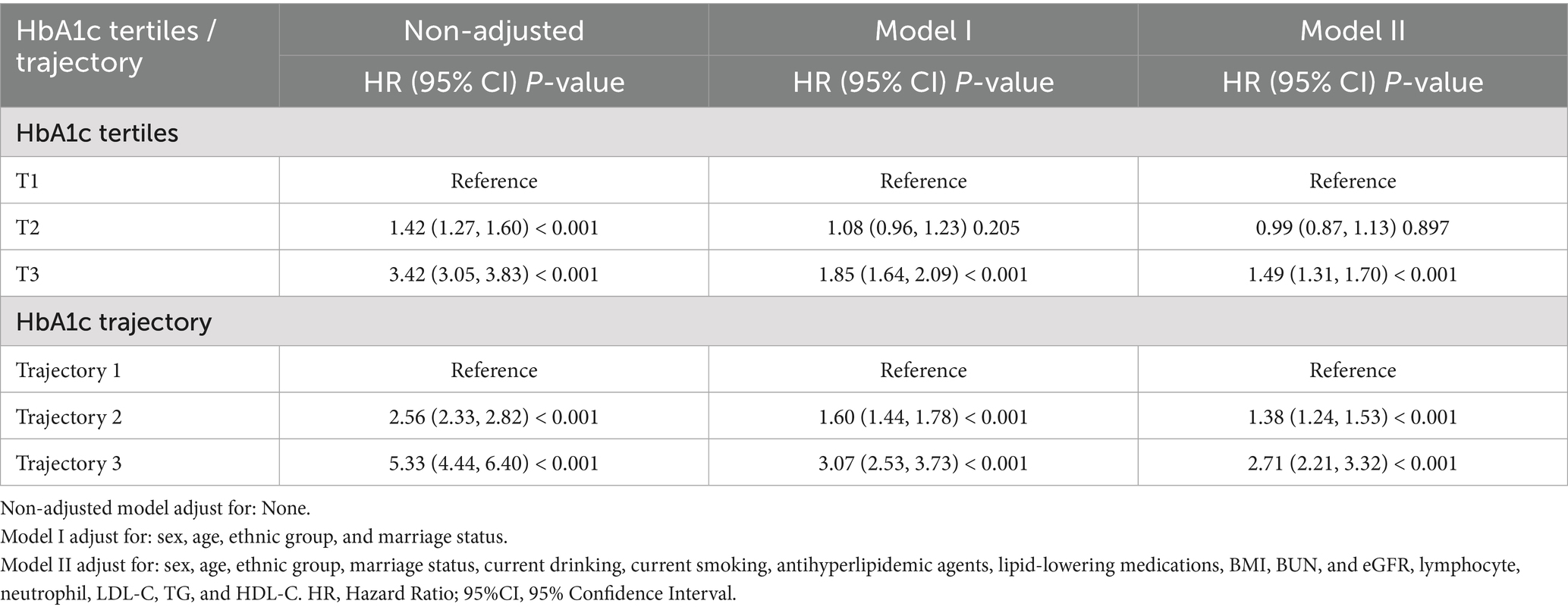 To facilitate comparison and validate the primary findings, Kaplan–Meier survival curves were constructed separately for baseline HbA1c tertile groups and trajectory groups, with differences assessed using log-rank tests. Multivariable Cox proportional hazards models were utilized to investigate associations between HbA1c and hypertension risk. Three distinct models were developed: an unadjusted model; Model I, adjusted for demographic factors (sex, age, ethnicity, and marital status); and Model II, comprehensively adjusted for all identified potential confounders. Confounding variables were selected by excluding factors with variance inflation factors (VIF) greater than 10. Restricted cubic spline analysis was performed within Cox models to explore dose–response relationships between baseline HbA1c, HbA1c trajectories, and hypertension risk. To ensure the robustness of our findings, three sensitivity analyses were performed: (1) inclusion of mean HbA1c as a predictor in the fully adjusted Cox model, (2) repeating the Cox analyses after excluding participants taking antihyperlipidemic and lipid-lowering medications, and (3) conducting sex-stratified subgroup analyses and testing for interaction between HbA1c and sex, given the relatively lower proportion of female participants (31.44%) in our cohort, and (4) logistic regression analyses to address potential time bias in hypertension onset detection inherent in health screening-based studies, using hypertension occurrence as a binary outcome variable with the same covariate adjustments as the Cox models. Furthermore, the predictive performance of baseline HbA1c tertiles versus HbA1c trajectory groups was compared based on incidence rates and hazard ratios for hypertension.