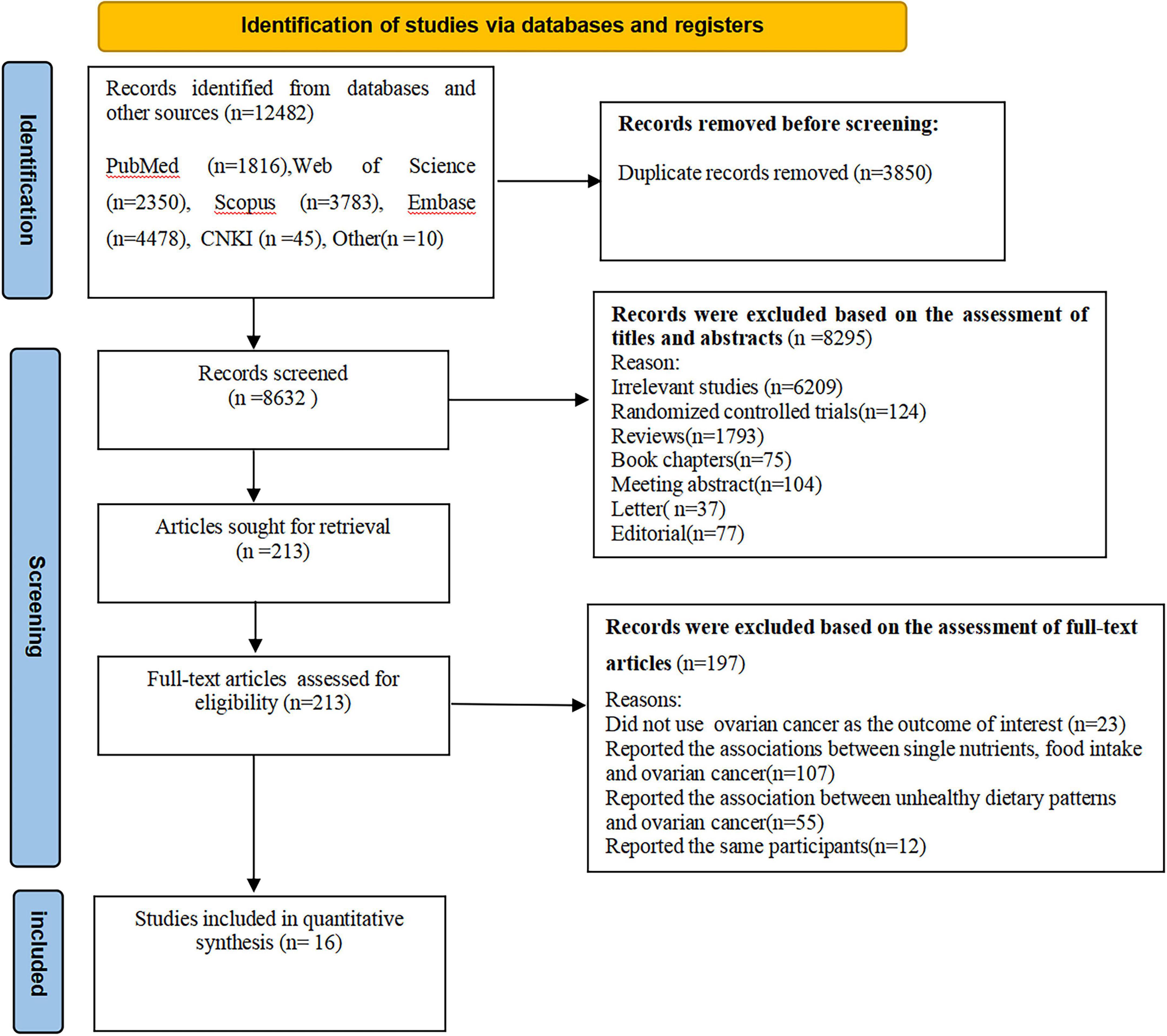 A flowchart of the study selection process is shown in Figure 1. In total, we identified 12,482 articles through five databases search and reference lists of retrieved articles, published reviews and meta-analyses. Subsequent to the removal of 3,850 duplicates, 8,632 articles remained for further screening the titles and abstracts. After evaluating the titles and abstracts, 8,295 articles were excluded. Of the remaining 213 full-text articles, 197 articles were excluded because of the following reasons: the outcome of interest was not ovarian cancer (n = 23), reported the associations between single nutrients, food intake and ovarian cancer (n = 107), reported the association between unhealthy dietary patterns and ovarian cancer (n = 55), and reported the same participants (n = 12). Finally, sixteen articles, including 12 prospective cohort (15, 17, 19, 20, 22, 23, 33–35, 36–38) and 4 case-control studies (16, 18, 21, 39) were included in the final analysis.