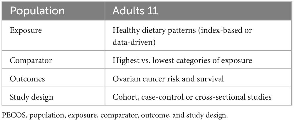 Healthy dietary patterns, which are generally characterized by high consumption of fruits, vegetables, fish, whole grains and low consumption of red meat, processed meat and refined grains, have been recommended for cancer prevention and survivorship (13, 14). Nevertheless, little is known about the impact of dietary patterns on ovarian cancer survival. Over the past decade, extensive attention has been focused on the role of dietary patterns specifically in ovarian cancer survival (15). Up to day, numerous epidemiological studies have shown the associations between overall dietary patterns and risk and survival of ovarian cancer (15–22), but their conclusions are still inconsistent. Even though some studies have shown the significant protective role of adherence to the healthy dietary patterns against ovarian cancer (18, 23), other studies found the apparent positive or null findings (16, 17, 21, 22). In addition, the continuous update project (CUP) by the World Cancer Research Fund/American Institute for Cancer Research (WCRF/AICR) did not make the firm conclusions about the links between dietary patterns and ovarian cancer (24). Notably, a previous meta-analysis of three observational studies showed no significant association between healthy dietary pattern and ovarian cancer risk (25). Alizadeh et al.’ meta-analysis mainly focused on ovarian cancer risk and only included three studies (1 cohort and 2 case-control studies). Furthermore, to the best of our knowledge, no meta-analysis thus far has been conducted to comprehensively assess the associations between healthy dietary patterns and survival of ovarian cancer. To fill in this literature gap, we carried out a systematic review and meta-analysis was to comprehensively review and synthesize the up-to-date evidence from previous studies published up to October, 2024 and to further ascertain the exact associations between healthy dietary patterns and risk and survival of ovarian cancer using meta-analysis.