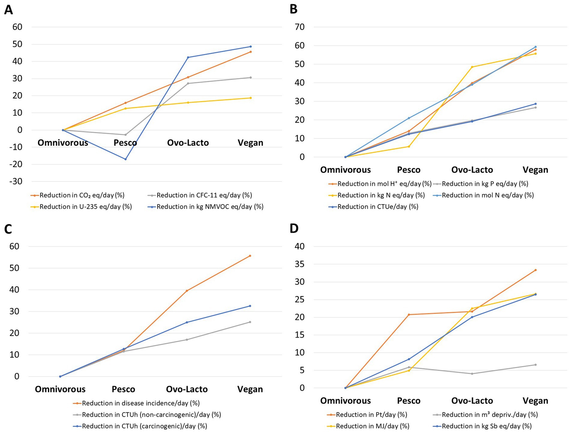 Four line graphs labeled A, B, C, and D show environmental and health impact reductions by diet type: Omnivorous, Pesco, Ovo-Lacto, and Vegan. Graph A highlights reductions in CO2, CFC-11, U-235, and NMVOC. Graph B shows reductions in H+, P, Ne, N, and CTUe. Graph C presents reductions in disease incidence, CTUh (non-carcinogenic and carcinogenic). Graph D displays reductions in Pt, m³ deprivation, MJ, and Sb. Each diet generally shows increased impact reduction from Omnivorous to Vegan, with variations in each category.
