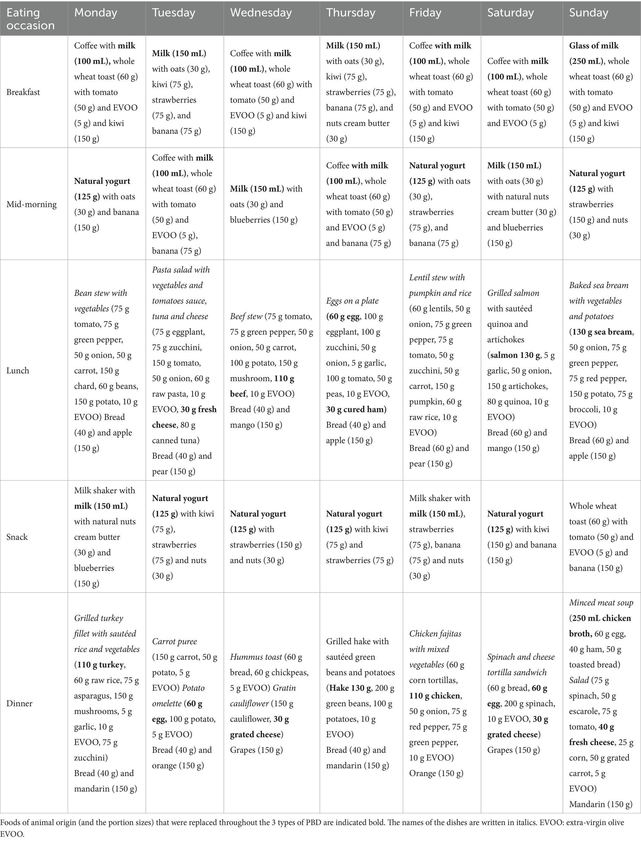 In the vegan diet menu, all animal-based foods (meat, fish, eggs and dairy) were excluded. These were replaced exclusively by PB foods, such as PB meat alternatives (tofu, textured soy protein, seitan, tempeh), PB beverages, soy yogurt, seeds, and legumes or legume flours.