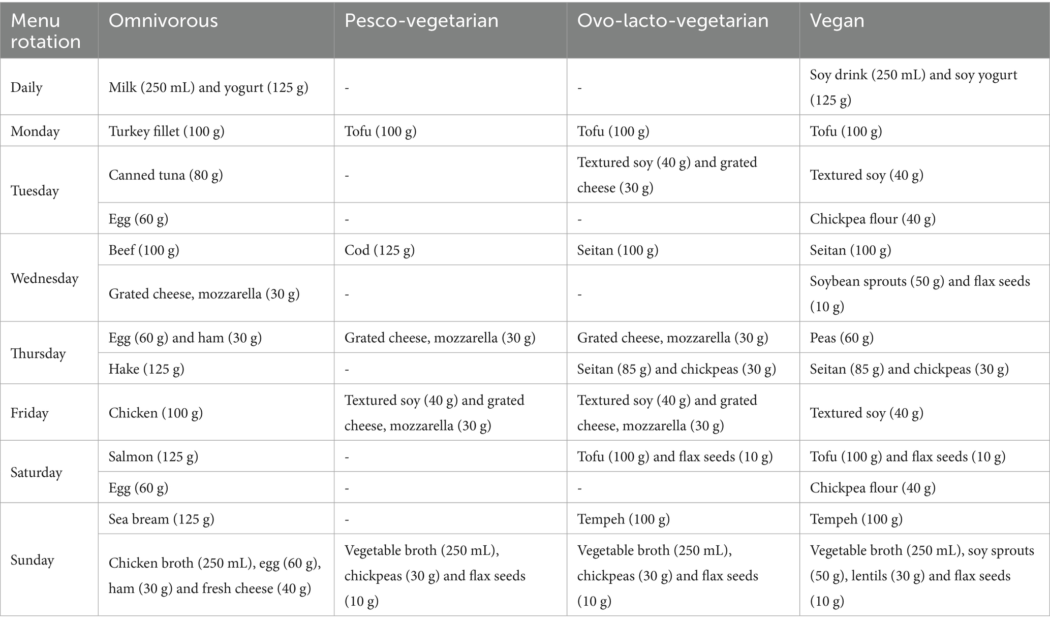 To adjust portion sizes, diet calibrations were conducted on the third day of the menu to check the diet design. i.e., the energy content was reviewed and modified, if needed, to remain within ± 10% of the target caloric intake (2,000 kcal). The omnivorous diet plan, which served as the basis for developing the vegetarian diets (pesco-vegetarian and ovo-lacto-vegetarian) and vegan diet is shown in Table 1.