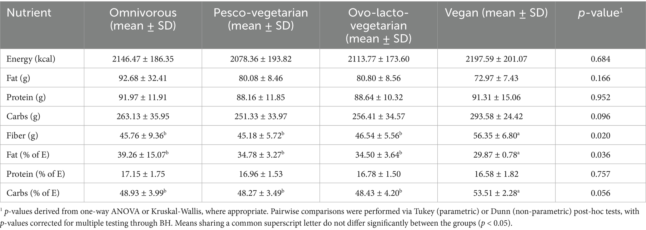 For each food and nutrient, the seven daily values per menu were treated as independent replicates (n = 7). Intakes were expressed as mean ± SD. Normality was checked with the Shapiro–Wilk test and homogeneity of variances with Levene’s test. If both assumptions held, a one-way ANOVA (factor = dietary pattern, 4 levels) was performed; otherwise, a Kruskal–Wallis test replaced ANOVA. When the overall test was significant (p < 0.05), pairwise differences were explored with Tukey’s HSD (parametric), or Dunn’s test (non-parametric) with Benjamini-Hochberg (BH) multiple testing correction. Analyses were run in Python 3.11 with SciPy 1.11, statsmodels 0.14 and scikit-posthocs 0.7, and in R version 4.4 (44).
