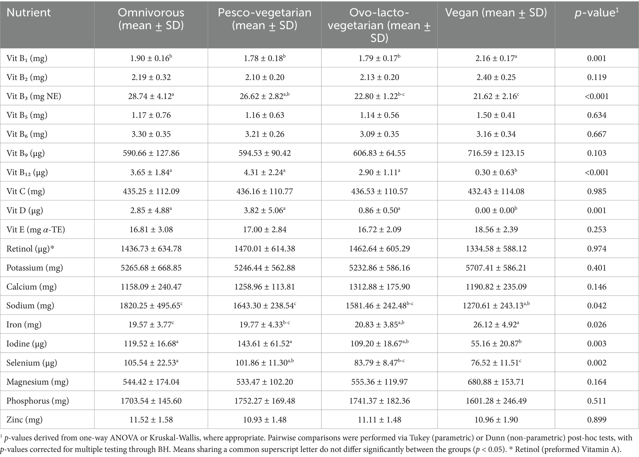 Table 4. Micronutrients: vitamins and minerals (mean ± SD; n = 7 days) presented in the isocaloric menus for omnivorous, pesco-vegetarian, ovo-lacto-vegetarian and vegan diets.