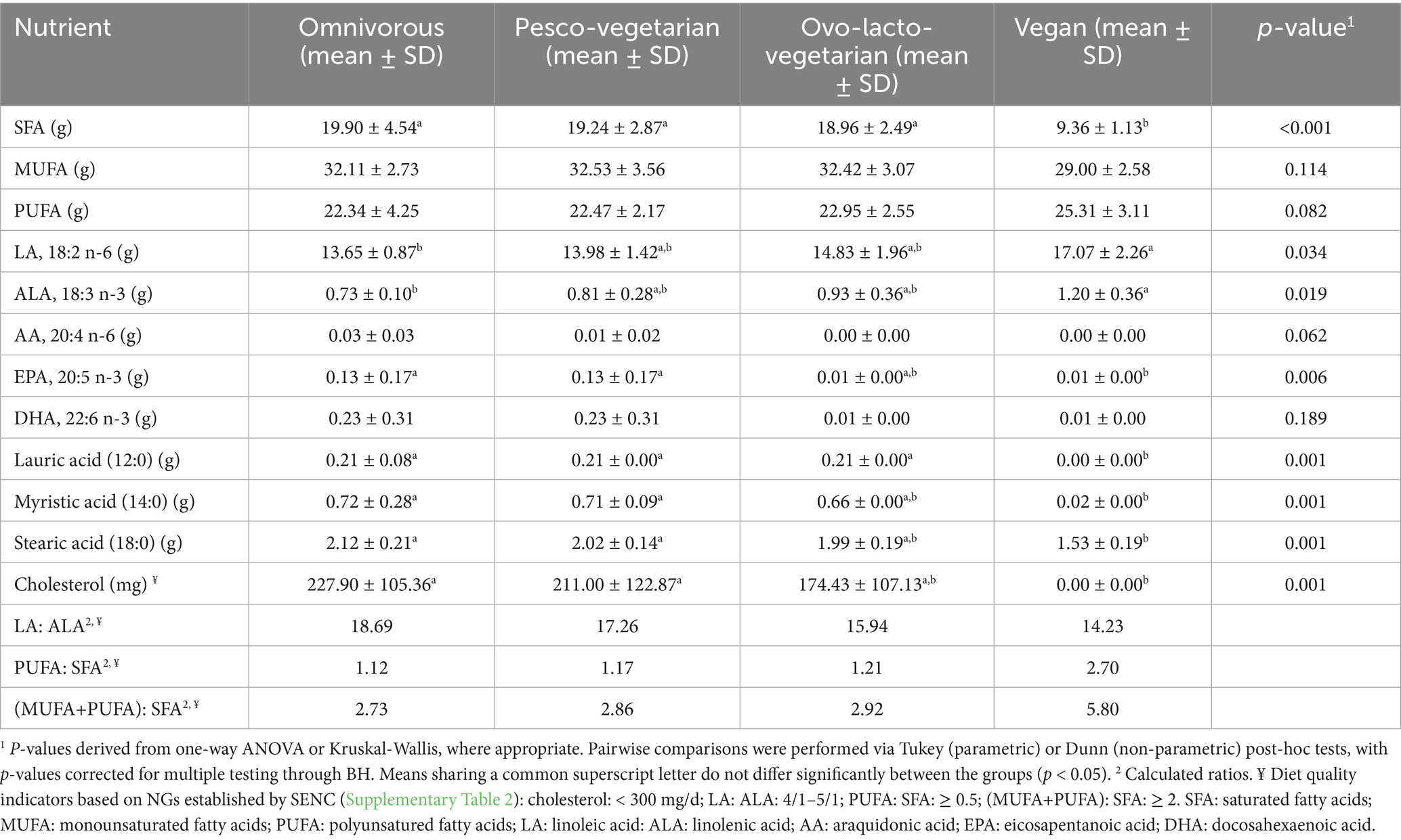 Table 3. Macronutrients (mean ± SD; n = 7 days) presented in the isocaloric menus for omnivorous, pesco-vegetarian, ovo-lacto-vegetarian and vegan diets.