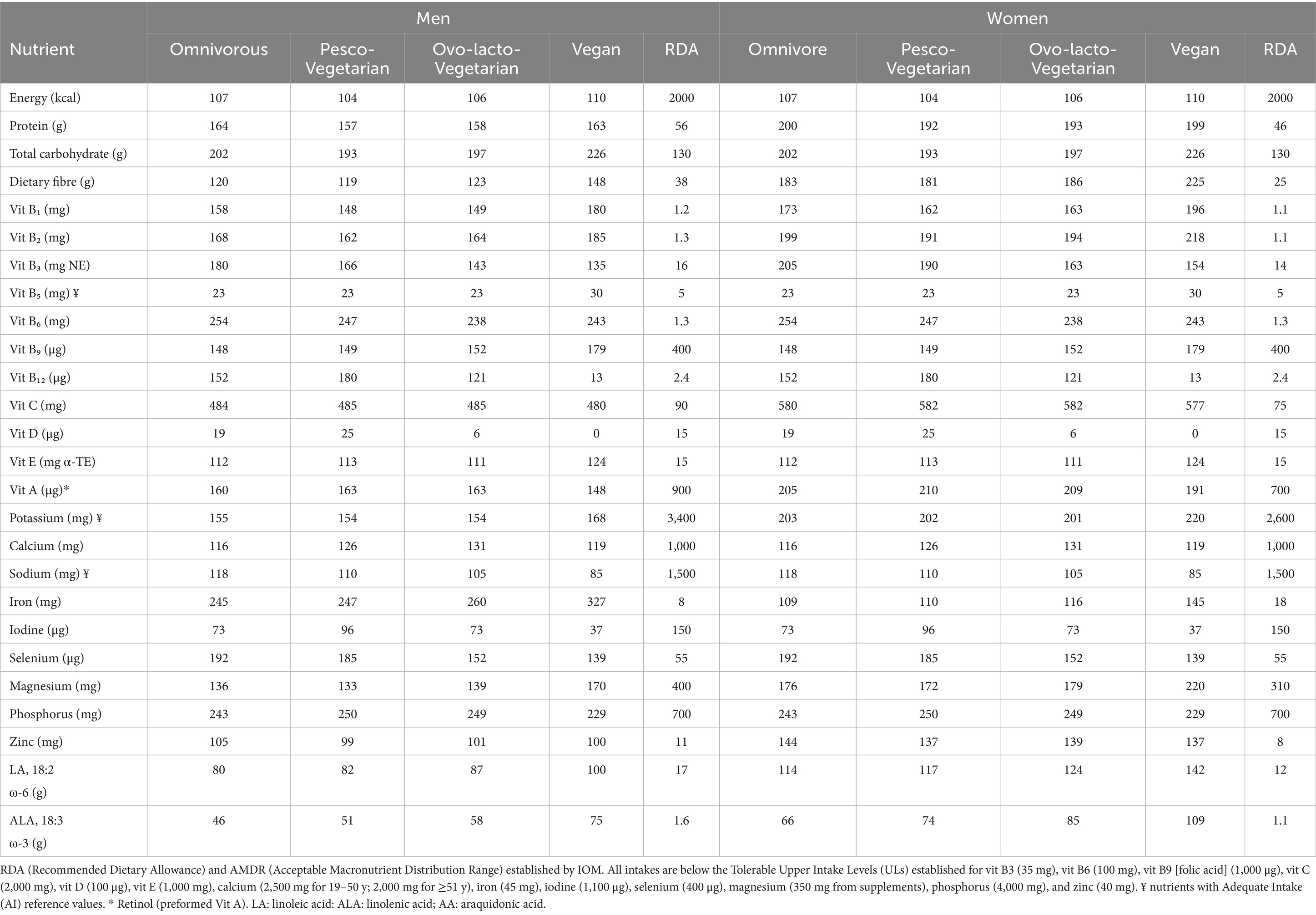 None of the four menus (diet groups) reached full (100%) coverage regarding the RDA for vitamins B₅ and vitamin D, and minerals including, iodine, or the essential fatty ALA, with some exceptions. Essential fatty acid requirements were met in vegan men regarding LA, only. Intake of ALA was under the threshold given by the RDA in all diet groups. By contrast, in women, LA requirements were met across the diet groups, whereas intakes of ALA complied with the recommendations among the vegans. These potential differences between men and women could be attributed to the 2,000 kcal diet menu fixed for both sexes.