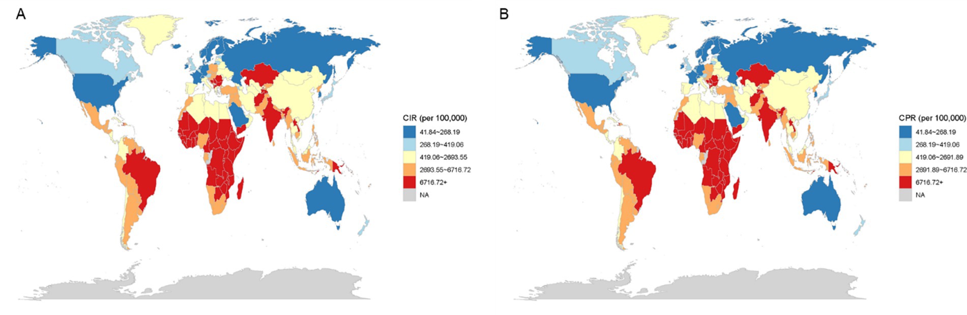 From 1990 to 2021, there was a significant decrease in the age-standardized incidence and prevalence rates of the global burden of VAD. The heatmap in Figure 3A showed the incidence rate of each age group in each region. Notably, Central, East, and West Sub-Saharan Africa consistently ranked as the top three regions with the highest incidence rates across all age groups. In these three regions, the incidence rate of patients younger than 5 years old was the highest. Similarly, the age distribution in other regions was mostly consistent with these three regions. Also, the distribution of prevalence of VAD (Figure 3B) was similar to that of incidence. The global map in Figure 4 further reported the incidence rate and prevalence of VAD, which was mutually supportive with the results reported in Figure 3.