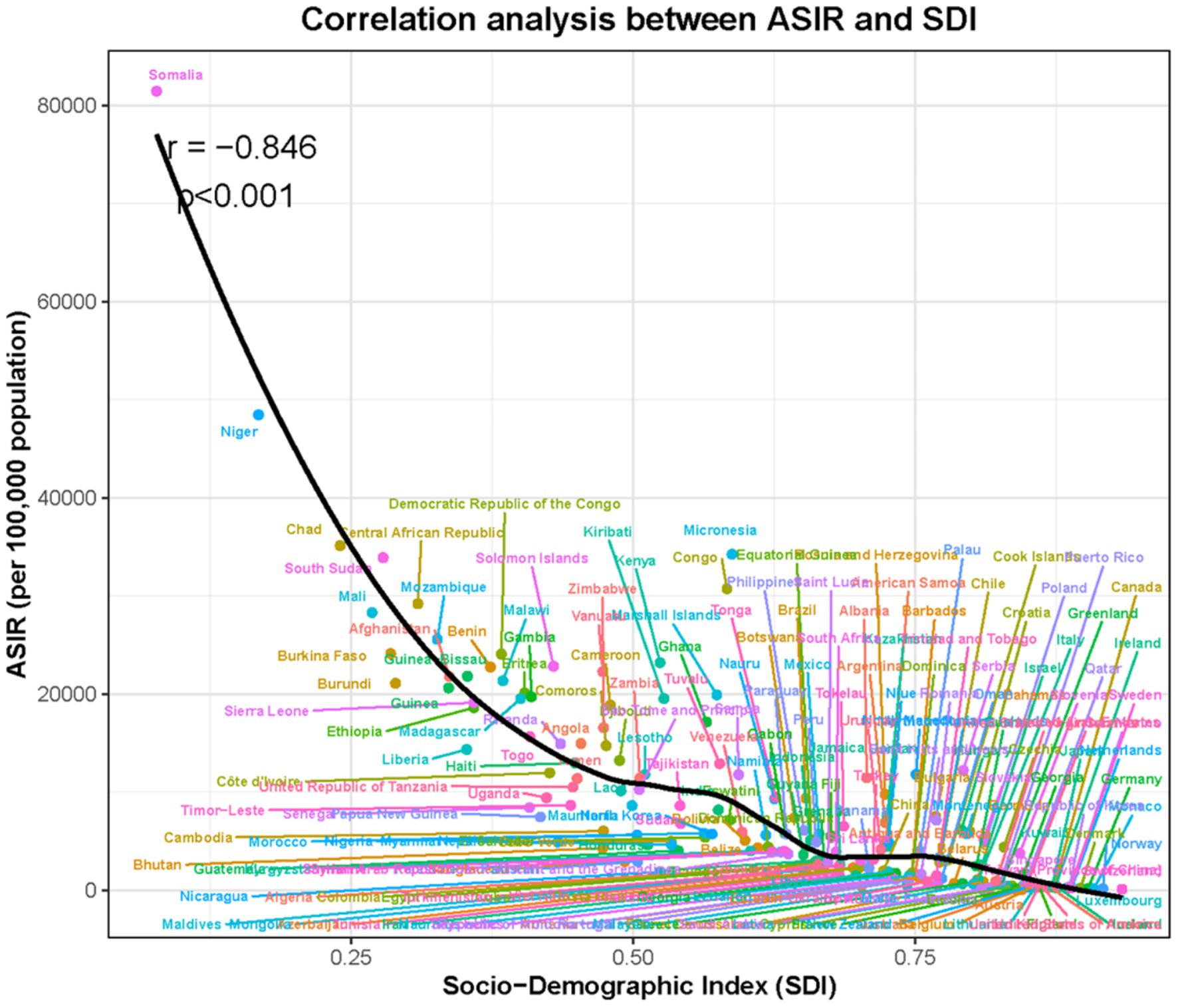We created scatter plots to examine the impact of SDI on VAD incidence trends, depicting changes in SDI and ASIR across 204 countries over the last 32 years. A negative correlation between SDI and the ASIR of VAD was observed across various countries, indicating that higher SDI levels consistently corresponded with lower VAD incidence (Figure 5).