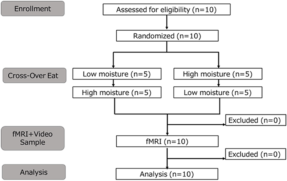 Text Flowchart of a study design.Enrollment phase has 10 participants assessed for eligibility. All participants receive both a low moisture diet and a high moisture diet in a cross-over design. fMRI and video samples are gathered from all 10 participants, with no exclusions. Analysis includes all participants.