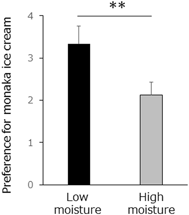 Figure 3. Preference was rated on a four–point scale (4, “strongly agree,” 3, “somewhat agree,” 2, “somewhat disagree,” 1, “strongly disagree”) preference with high or low moisture monaka was evaluated six times per session, for a total of four sessions. Values are means ± SD for 10 samples. **p < 0.01.
