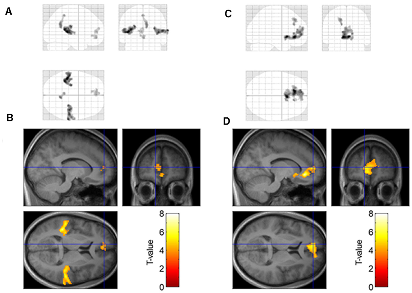 Figure 4. Brain regions significant activation in response to low moisture vs. high moisture samples (A, B) and significant relationship with preference rating scores (C, D) at p < 0.05 cluster–level FWE–corrected for multiple comparisons. The red–yellow color scale indicates the T–values. The blue cross indicates the location of the medial prefrontal cortex (mPFC)(x = −12, y = 50, z = 8).