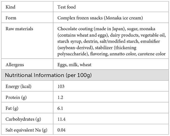 Two types of monaka ice cream (both manufactured by Morinaga & Co., Ltd.) were used in this study: one with a high wafer moisture content (12%) and one with a low wafer moisture content (7%). The compositions of the test foods were identical, except for the moisture content of the wafer. An image and the nutritional components of the test foods are shown in Figure 2 and Table 1.