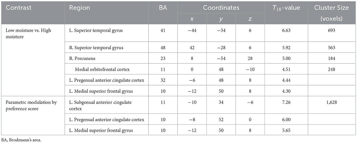 Initially, the contrast between high- and low-wafer-moisture content conditions was examined at the second level. Next, a positive linear relationship between brain activity and preference ratings was tested using parametric modulation analysis. We identified significant clusters at p < 0.05, family wise error (FWE)-corrected for multiple comparisons over the whole brain, with a cluster-forming threshold of p < 0.001, uncorrected (17, 18). Although stringent correction increases the risk of Type II errors in small samples, we deliberately adopted a conservative approach, reporting only those effects that were sufficiently robust to withstand rigorous control for false positives, even at the cost of reduced sensitivity. The brain structures were anatomically labeled and identified according to Brodmann's area using the Automated Anatomical Labelling atlas (19, 20) and Brodmann maps (Brodmann.nii) provided by MRIcron software (https://people.cas.sc.edu/rorden/mricron/index.html). The area of activation is superimposed on the mean normalized structural images of the participants to illustrate the anatomical regions in the figures.