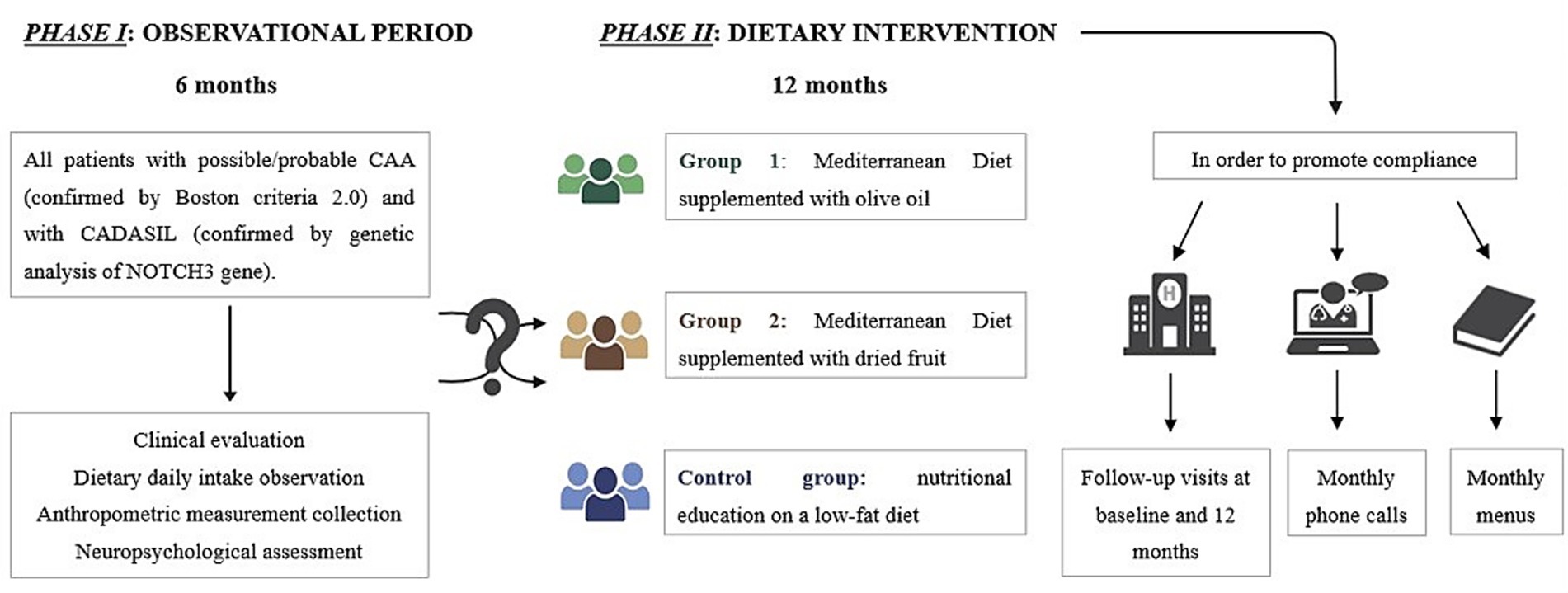 Flowchart illustrating a study with two phases. Phase I: Observational Period (6 months) involves evaluating patients with probable CAA and CADASIL using clinical evaluations, dietary observation, anthropometric measurements, and neuropsychological assessments. Phase II: Dietary Intervention (12 months) divides patients into three groups: Group 1 receives a Mediterranean diet with olive oil, Group 2 with dried fruit, and a control group with low-fat diet education. Compliance is promoted through follow-up visits, monthly calls, and menus.
