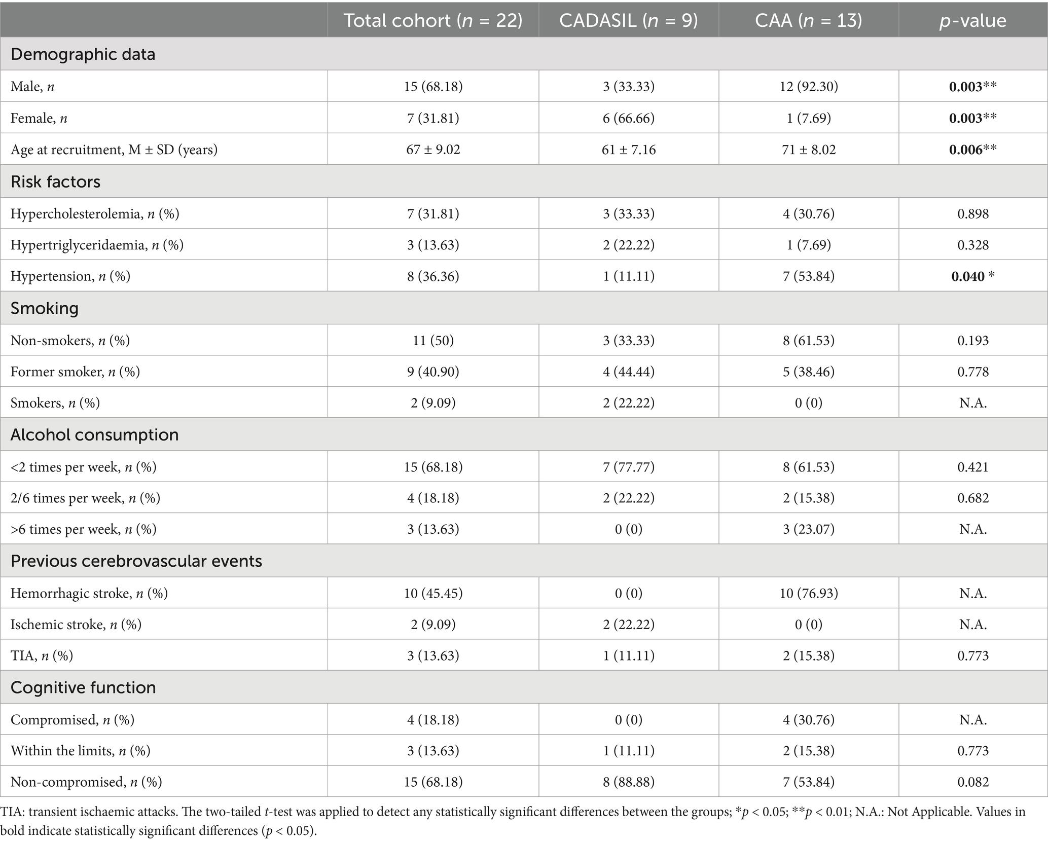 The CAA patient group (n = 13) had a mean age at recruitment of 71 ± 8.02 years, and the majority of patients were male (92.30%). The most prevalent vascular risk factor was hypertension, present in 53.84% of cases, followed by hypercholesterolemia (30.76%) and hypertriglyceridemia (7.69%). No active smokers were reported, whereas 38.46% were former smokers and 61.53% had never smoked. Regarding alcohol consumption, 61.53% reported drinking less than twice per week, while 15.38% drank 2–6 times weekly and 23.07% consumed alcohol more than 6 times per week. Hemorrhagic stroke was the most frequent cerebrovascular event, affecting 76.93% of patients, while no Ischemic strokes were reported. Transient Ischemic attacks (TIA) occurred in 15.38% of cases. Cognitive function was classified as compromised in 30.76%, impaired but with borderline results in 15.38%, and non-compromised in 53.84% of patients. Demographic data, risk factors, and clinical characteristics of the enrolled CAA patients are reported in the third column of Table 1.