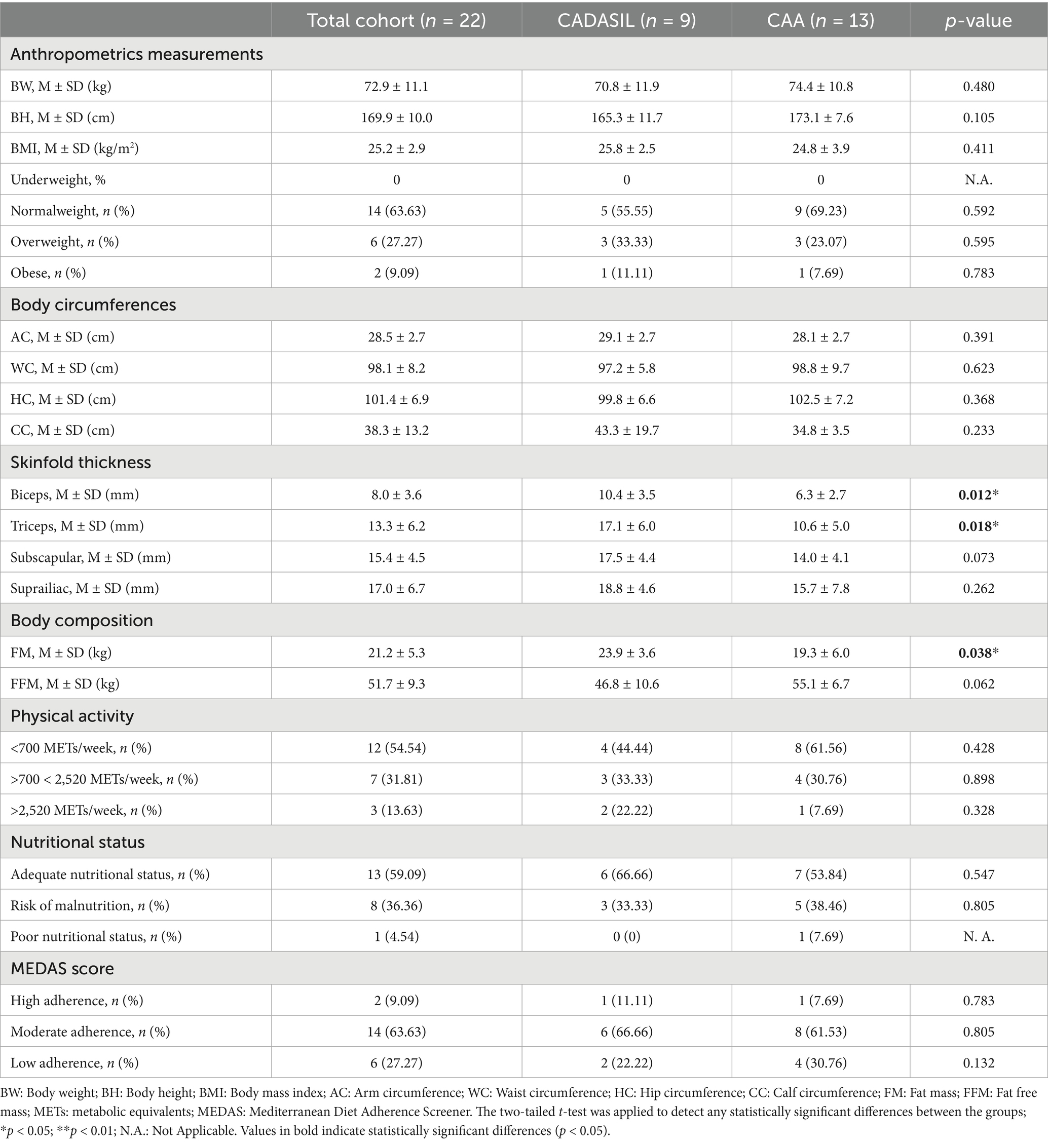 Body composition assessment showed that bicipital and tricipital skinfold thicknesses, as well as FM (Kg), differed significantly between the CADASIL and CAA groups. These differences in body composition could reflect the different pathophysiological profiles and long-term outcomes associated with distinct stroke subtypes. Supporting this hypothesis, Wilczyński and colleagues (34) demonstrated that individuals recovering from a hemorrhagic stroke have significantly reduced FM, compared to survivors of an ischemic stroke, which the authors attributed to a combination of more severe neurological damage, higher metabolic demands and complications, such as dysphagia. Our results are concordant with these findings: patients with CAA, most of whom experienced hemorrhagic strokes, presented lower FM and reduced skinfold measurements, when compared to CADASIL patient. However, these results should be interpreted carefully, given the unbalanced nature of our sample, which could limit the generalizability of the findings.