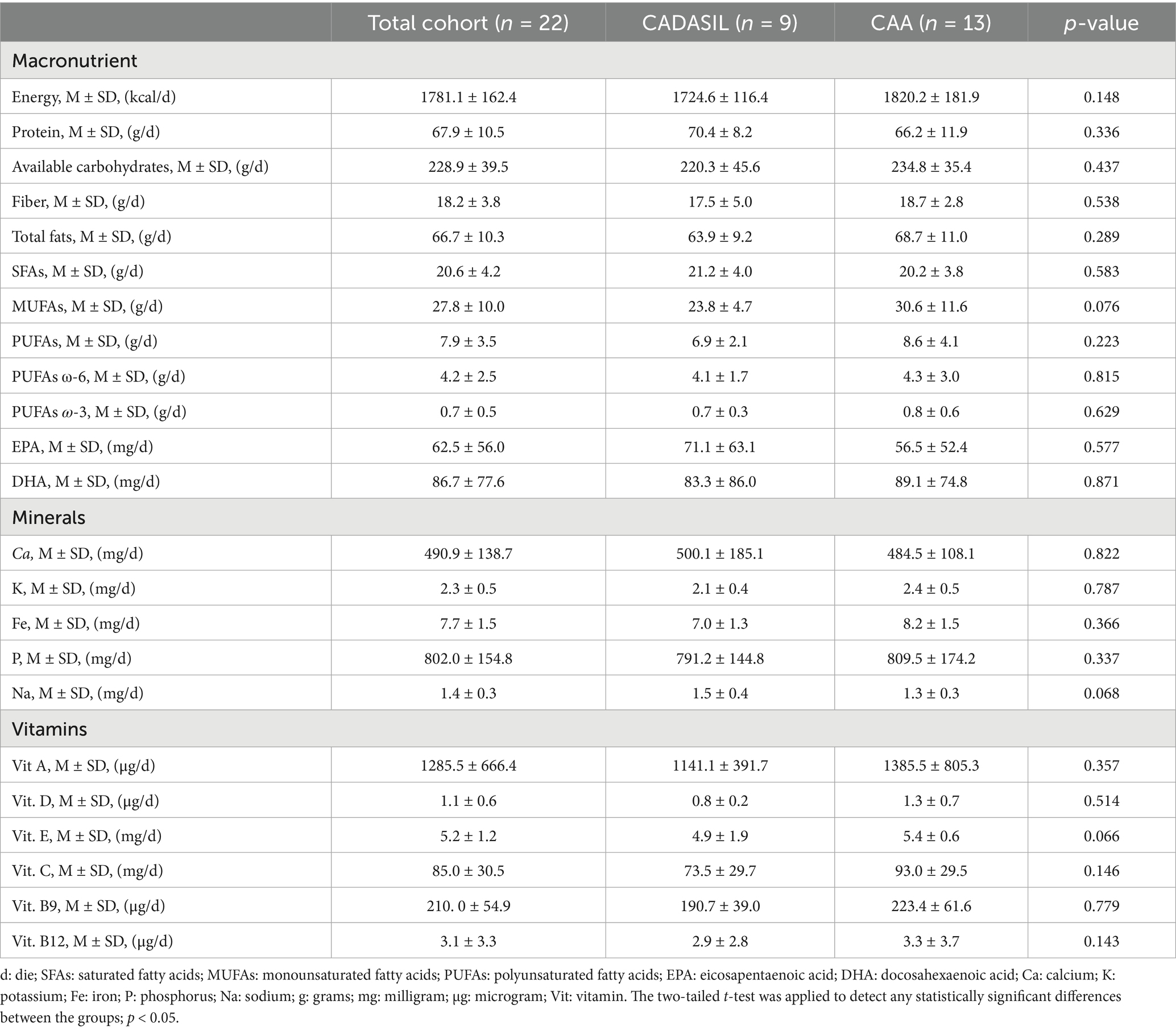Table 3 shows the mean and standard deviation (M ± SD) of average daily intakes of energy, protein, available carbohydrates, fiber and total fats, as well as minerals (calcium, potassium, iron, phosphorus, sodium) and vitamins (A, D, E, C, B9, B12), for the whole study cohort. No statistically significant differences were observed between CADASIL and CAA patients in terms of daily energy intake and distribution across macronutrients and micronutrients.