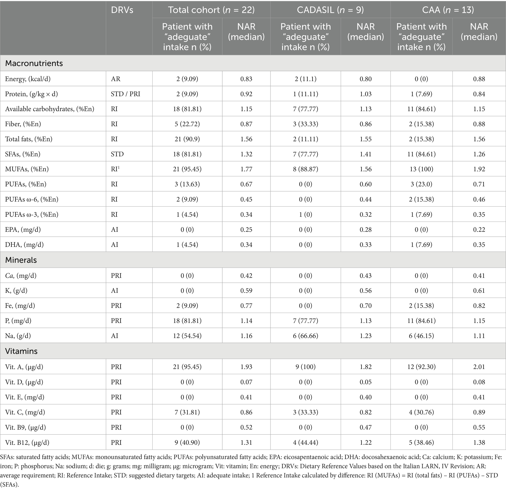 In CADASIL patients, daily energy intake (kcal/d) and fiber intake (%En) were inadequate, with median NARs of 0.80 and 0.86, respectively. Conversely, protein intake (g/kg x d) and available carbohydrate intake (%En) exceeded DRVs. The intake of total fats (%En), SFAs (%En), and MUFAs (%En) was notably higher than recommended levels, as reflected by median NARs of 1.55, 1.41, and 1.56, respectively. However, none of the patients reached the DRVs for total PUFAs (%En), PUFAs ω-6 and ω-3, EPA (mg/d), and DHA (mg/d).