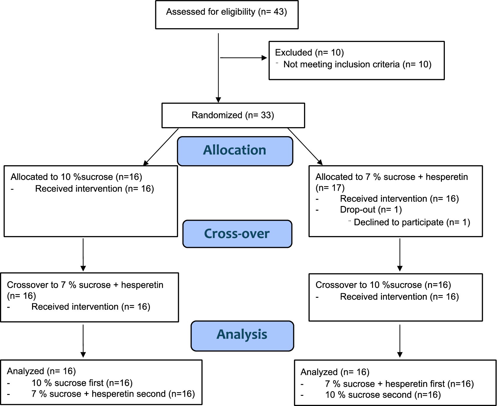 The interventional part of the study was carried out between January 2023 and May 2023 as a single blinded, randomized, cross-over, human intervention study at the facilities of the Institute for Physiological Chemistry at the University of Vienna with two treatments: 10% (w/v) sucrose in 300 ml of water and 7% (w/v) sucrose with 50 mg/L hesperetin. Participants received one intervention per study day, with at least 5 days between the interventions and were blinded about the order of the treatments (single-blinded study design). The order of the interventions was allocated using the online randomizer “randomizer.org.” The primary outcomes were the time-dependent fluctuations in blood glucose concentrations and the 2 h post-load ad libitum energy intake. To investigate the underlying mechanisms, the individual appetite score, metabolic and hormonal responses to the interventions were measured as secondary outcome parameters.