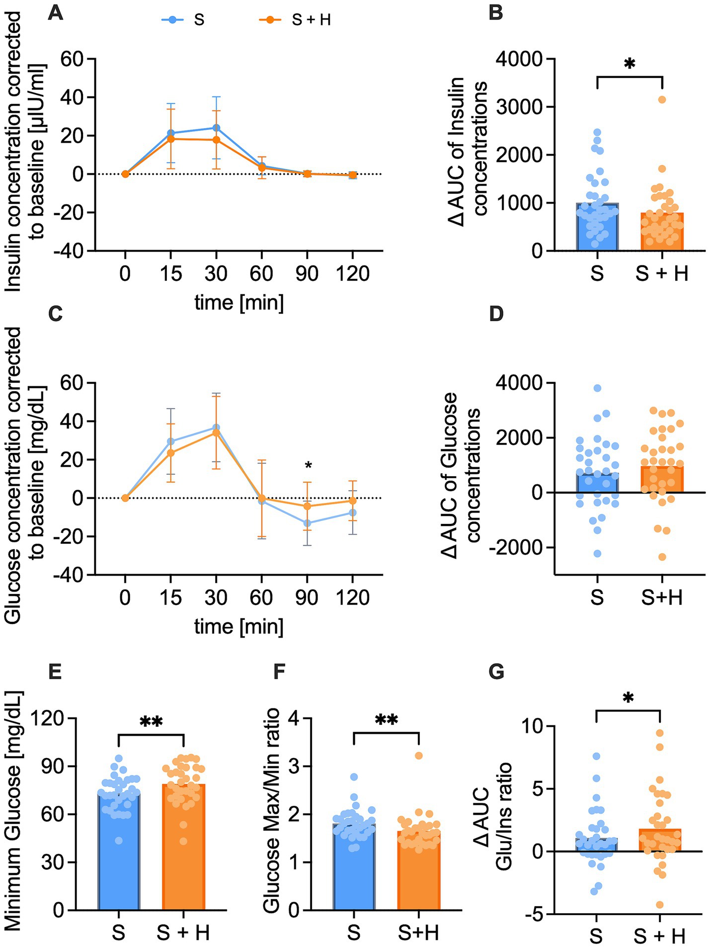 Figure 2. Plasma insulin [μlU/ml] and glucose [mg/dl] concentration over a time span of 120 min after consumption of the test solution S (10% sucrose) or S + H (7% sucrose with 15 mg of hesperetin). (A) Baseline corrected plasma concentration of insulin and (B) corresponding net- area under the curve (AUC) over a time span of 120 min. (C) Baseline corrected plasma levels of glucose and (D) corresponding net-AUC over a time span of 120 min. Statistical differences of plasma concentrations over time were tested by Repeated-Measures Two-way ANOVA with Šidák’s Multiple Comparison Test (*p < 0.05). Data is presented as mean ± standard deviation. Differences in AUCs were analyzed using a paired, two-tailed Student’s t-test (* p < 0.05). (E) Minimum glucose concentration over a time span of 120 min. (F) Ratio of maximum to minimum glucose concentration. (G) Ratio of mean glucose net-AUC to insulin net-AUC. Statistical differences for E-G were assessed by applying a paired Student’s t-test, two-tailed p-value (* p < 0.05, ** p < 0.01), (n = 32). Individual values (n = 32) for each participant are depicted by dots.