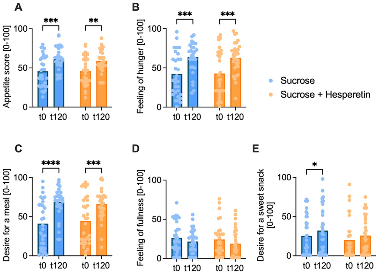 Figure 3. Appetite score pre- and 120 min post-load. The overall appetite score (A), calculated from feeling of hunger (B), desire for a meal (C), feeling of fullness (D) and desire for a sweet snack (E), was rated by the participants at baseline (t0) and 120 min after drinking of the test solution (t120) on a digital 100 mm visual analog scale. Bar charts show the mean values, dots indicate individual values, statistical differences were tested by Repeated-Measures Two-way ANOVA with Tukey’s Multiple Comparisons Test (* p < 0.05, ** p < 0.01, *** p < 0.001, **** p < 0.0001), (n = 32).