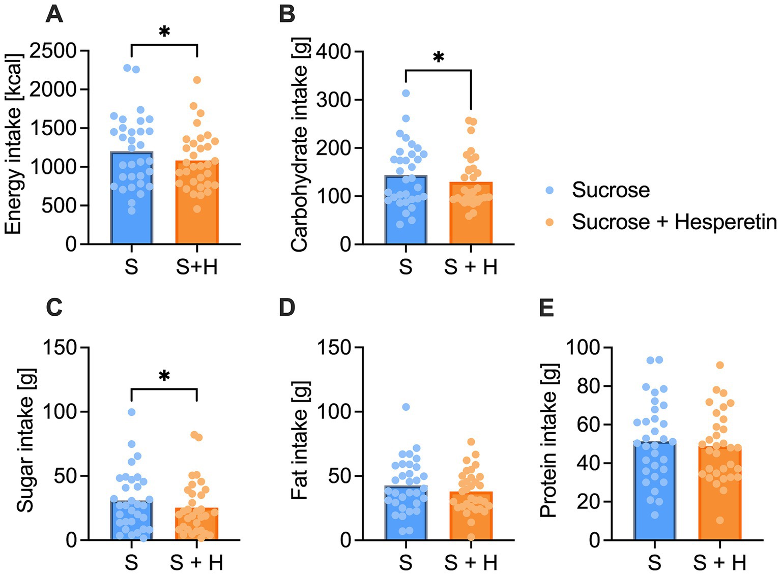 Figure 4. Total energy and nutrient intake of the standardized continental ad libitum breakfast. (A) Mean overall energy intake [kcal] (B), carbohydrate intake [g] (C), sugar intake [g], (D) fat intake [g] and (E) protein intake [g] 2 h after the consumption of a 10% sucrose solution (S) or a 7% sucrose solution with 15 mg of hesperetin (S + H). Statistical differences were tested by using a paired Student’s t-test, two-tailed p-value (* p < 0.05) (n = 32). The individual values of the test persons are depicted by dots.