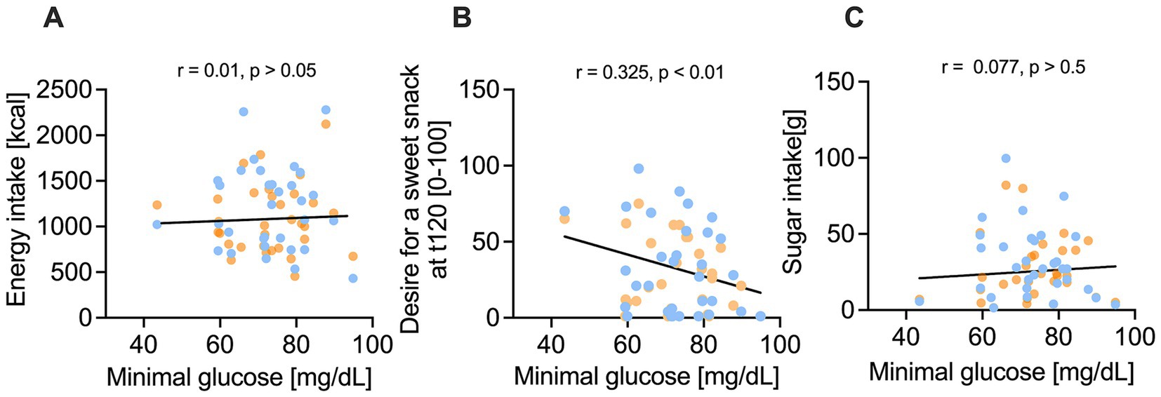 Figure 5. Correlation of minimum glucose concentration [mg/dl] and nutrient intake and sweet cravings after 10% sucrose solution (blue) versus 7% sucrose solution with added 50 mg/L hesperetin (orange). (A-C) Illustrate that nutrient intake is not correlated with the minimum plasma glucose concentration, but a lower minimum glucose concentration was associated by a significant correlation coefficient r with a higher desire for a sweet snack 120 min after consuming the test solution (t120). Statistical significance was tested by using a simple linear regression with two tailed p-value (n = 32).