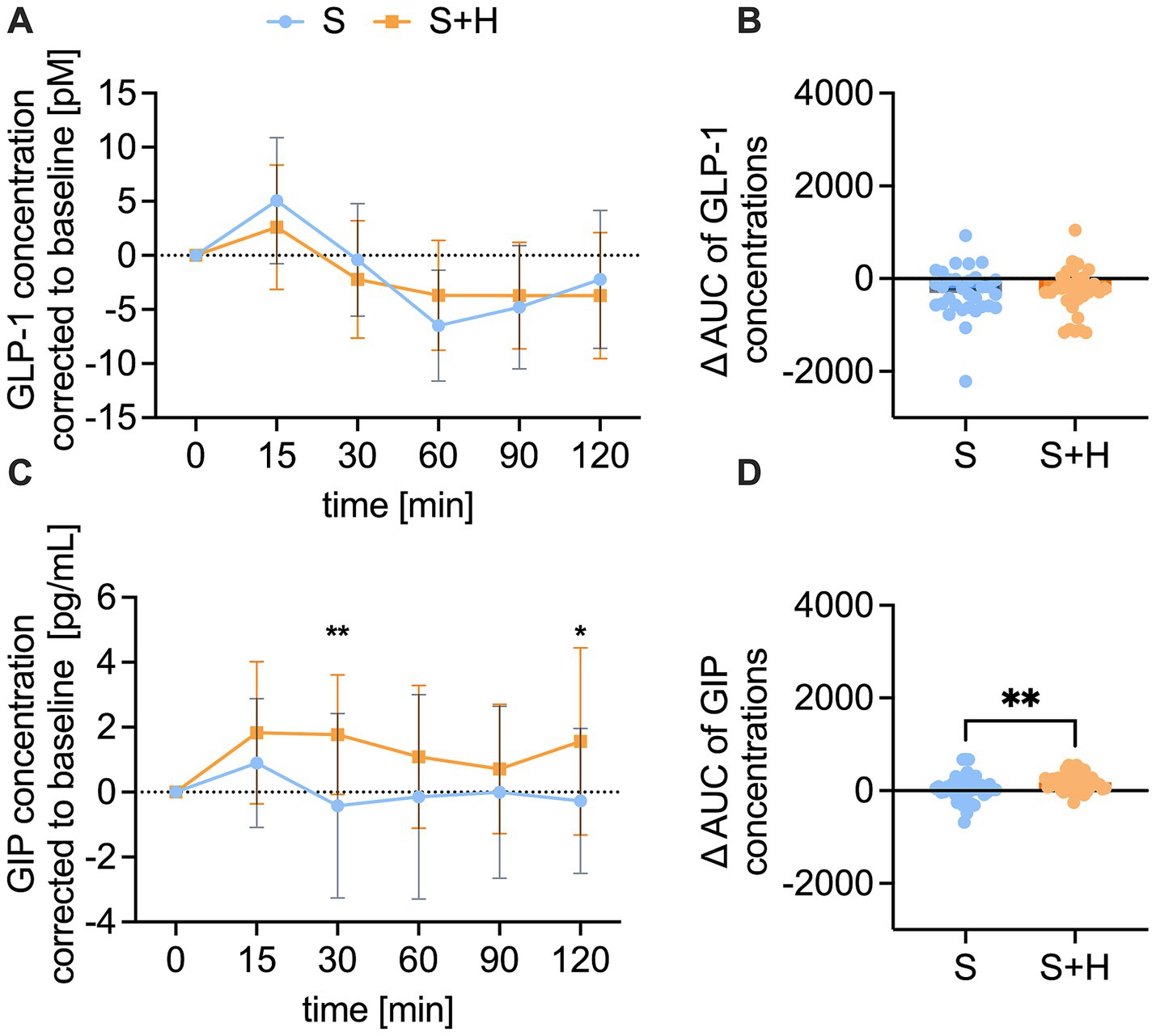 Figure 6. Plasma concentration of glucagon-like peptide-1 (GLP-1) [pM] and gastric inhibitory peptide (GIP) [pg/ml] after consumption of the test solution S (10% sucrose) or S + H (7% sucrose with 15 mg of hesperetin). (A) Baseline corrected plasma concentration of GLP-1 and (B) corresponding net-area under the curve (AUC) over a time span of 120 min. (C) Baseline corrected plasma levels of GIP and (D) corresponding net-AUC over a time span of 120 min. Statistical differences of time-dependent plasma concentrations were tested by Repeated-Measures Two-way ANOVA with Šidák’s Multiple Comparison Test (*p < 0.05). Values are depicted as mean ± standard deviation. Differences of AUCs were assessed using a paired, two-tailed Student’s t-test, (* p < 0.05, ** p < 0.01). The individual values (n = 32) of the test persons are depicted by dots.