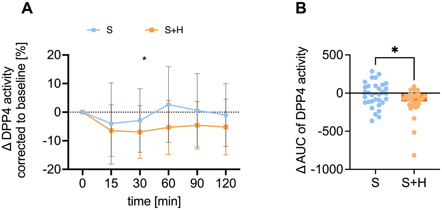 Figure 7. Plasma activity of dipeptidyl-peptidase 4 (DPP4) [%] after administration of the test solution S (10% sucrose) or S + H (7% sucrose with 15 mg of hesperetin). (A) Baseline corrected DPP4 activity in plasma over a time span of 2 h. Statistical differences were tested by Repeated-Measures Two-way ANOVA with Šidák’s Multiple Comparison Test (*p < 0.05), (n = 32). Values are depicted as mean ± standard deviation. (B) Mean plasma net-area under the curve (AUC) of DPP4. Statistical differences were tested with paired two-tailed Student’s t-test, (* p < 0.05), (n = 32). The individual values of the test persons are depicted by dots.