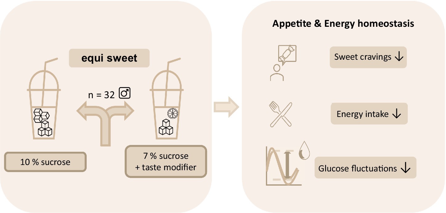 Taste is considered to be one of the key drivers for the decision to consume foods. Among the primary taste modalities, sweetness is consistently identified as the most highly preferred sensory attribute (1). Sweet taste is mediated by the canonical sweet taste receptor, consisting of the subunits TAS1R2 and TAS1R3 (2). Besides the oral cavity, presence of the sweet taste receptor has also been proven in several non-gustatory tissues, such as the gastrointestinal tract. Here, the TAS1R3 subunit has been found to be the predominant form. Stimulation of extraoral TAS1R3 has been shown to be involved in the expression and secretion of gastrointestinal appetite-regulating hormones such as glucagon-like peptide-1(GLP-1) (3), gastric inhibitory peptide (GIP) (4) and the neurotransmitter serotonin (3). The activation of TAS1R3 also stimulates the release of several peptide hormones in enteroendocrine cells, including leptin, ghrelin, peptide tyrosine-tyrosine (PYY) and cholecystokinin (5). Some of these anorectic hormones, e.g., GLP-1, GIP and PYY, get rapidly degraded by the enzyme Dipeptidyl-peptidase 4 (DPP4) (6, 7). Therefore, DPP4 is a key player not only in glucose homeostasis, but also important for the regulation of food intake and DPP4-inhibitors provide a promising target for regulating blood glucose fluctuations and insulin sensitivity in type two diabetes mellitus treatment (8). In addition, the activity of DPP4 has been recently shown to be regulated by TAS1R3 activation in enterocytes (9). Those studies demonstrate a prominent role for TAS1R3 for appetite regulation on a mechanistic level. Moreover, besides the activation of extraoral sweet taste receptor subunits, the impact of the sole perception of sweetness in the regulation of metabolic functions has been controversially discussed in literature. Particular emphasis has been directed towards cephalic phase insulin release and its role in postprandial hyperglycemia, as recently reviewed by Langhans et al. (10). Although findings in isolated islets supported a role for the sweet taste receptor subunits in insulin release (11), results from in vivo studies were more controversial. While Just and colleagues showed a stimulation of insulin release following the tasting of a sucrose solution and spitting it out afterwards (12), other studies did not detect increased insulin secretion by just tasting the disaccharide without swallowing (13–15). In those studies, however, accidental swallowing of small amounts of sucrose cannot be completely excluded. Previous studies of our own group however demonstrated that the intensity of sweetness perception had no effect on blood glucose regulation after administration of isocaloric glucose or sucrose-containing solutions in combination with the sweet taste receptor antagonist lactisole (16). Similarly, modulation of the sweetness level of a sucrose solution by addition of lactisole or rebaudioside M did not affect postprandial blood glucose regulation and energy intake regardless of the sweet taste sensitivity of the test persons (17). However, the addition of lactisole to a sucrose, but not glucose solution reduced postprandial energy intake (18) and GLP-1 plasma concentrations (16), arguing for an interplay of glucose transporters and the sweet taste receptor for nutrient sensing. Therefore, it remains unclear whether reducing the sucrose load while maintaining the perceived sweetness intensity will have beneficial effects expected of a reduced sugar content, or whether the similar activation of oral and/or extra-oral sweet taste receptors will lead to a similar hormonal response as the higher concentrated sugar solution. Maintaining sweetness while reducing sugar content can be achieved using flavoring substances with modifying properties (FMP). FMPs have no or a low intrinsic sweet taste but can modify the perceived sweetness in combination with sugar. This allows for sugar reduction while preserving the consumer’s preferred sweet taste without the undesired side tastes of other non-nutritive sweetener (19).
